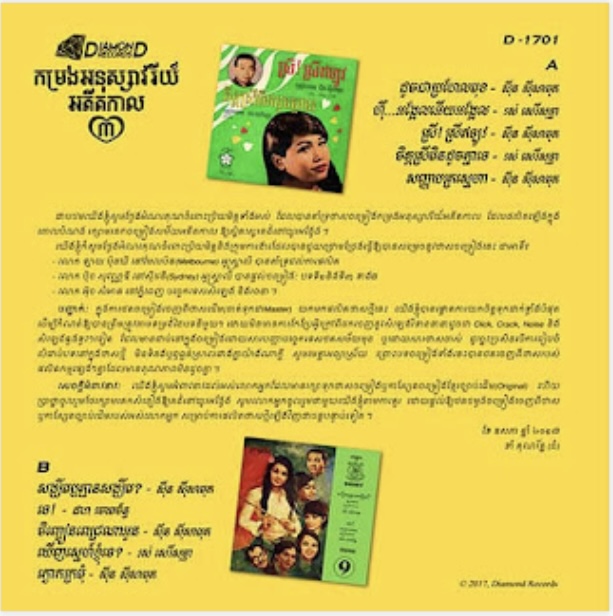 - ចេញផ្សាយជាថាស (Vinyl) ដោយក្រុមហ៊ុន DIAMOND RECORDS (33-D1701) - (A) ចិត្តស្រីមិនដូចគ្នាទេ បទទី៤ នៅ Side A - ថាស - ក្របមុខ - ក្របក្រោយ