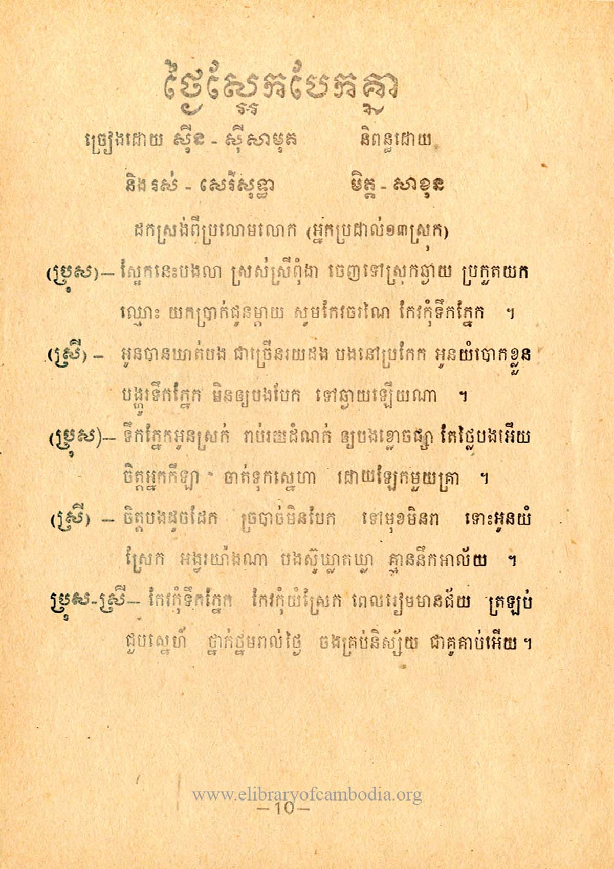 - យើងមានអត្ថបទ និងអក្សរភ្លេង ដកស្រង់ចេញពីសៀវភៅ ចម្រៀងខ្ញុំសែនពេញចិត្ត ទំព័រទី 10