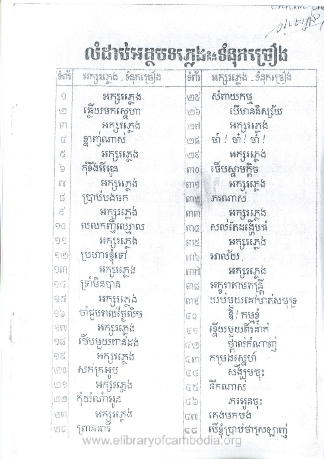 យើងខ្ញុំមានបំណងរក្សាសម្បត្តិខ្មែរទុកនៅលើគេហទំព័រ www.elibraryofcambodia.org នេះ ព្រមទាំងផ្សព្វផ្សាយសម្រាប់បម្រើជាប្រយោជន៍សាធារណៈ ដោយឥតគិតរក និងយកកម្រៃ នៅមុនថ្ងៃទី១៧ ខែមេសា ឆ្នាំ១៩៧៥ ចម្រៀងខ្មែរបានថតផ្សាយលក់លើថាសចម្រៀង 45 RPM 33 ½ RPM 78 RPM ដោយផលិតកម្ម ថាស កណ្ដឹងមាស ឃ្លាំងមឿង ចតុមុខ ហេងហេង សញ្ញាច័ន្ទឆាយា នាគមាស បាយ័ន ផ្សារថ្មី ពស់មាស ពែងមាស ភួងម្លិះ ភ្នំពេជ្រ គ្លិស្សេ ភ្នំពេញ ភ្នំមាស មណ្ឌលតន្រ្តី មនោរម្យ មេអំបៅ រូបតោ កាពីតូល សញ្ញា វត្តភ្នំ វិមានឯករាជ្យ សម័យអាប៉ូឡូ សាឃូរ៉ា ខ្លាធំ សិម្ពលី សេកមាស ហង្សមាស ហនុមាន ហ្គាណេហ្វូ អង្គរ Lac Sea សញ្ញា អប្សារា អូឡាំពិក កីឡា ថាសមាស ម្កុដពេជ្រ មនោរម្យ បូកគោ ឥន្ទ្រី Eagle ទេពអប្សរ ចតុមុខ ឃ្លោកទិព្វ ខេមរា មេខ្លា សាកលតន្ត្រី មេអំបៅ Diamond Columbo ហ្វីលិព Philips EUROPASIE EP ដំណើរខ្មែរ ទេពធីតា មហាធូរ៉ា ជាដើម។