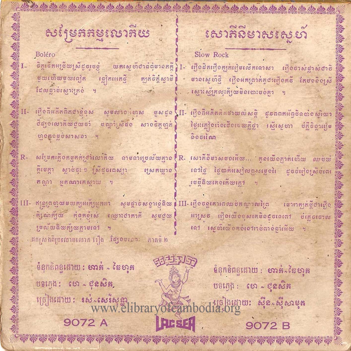 - ចេញផ្សាយជាថាស (Vinyl) ដោយផលិតកម្ម អប្សារា (R 9072) - (A) សម្រែកកម្មលោកីយ - (B) សោភីនីមាសស្នេហ៏ - ក្របមុខ - ក្របក្រោយ