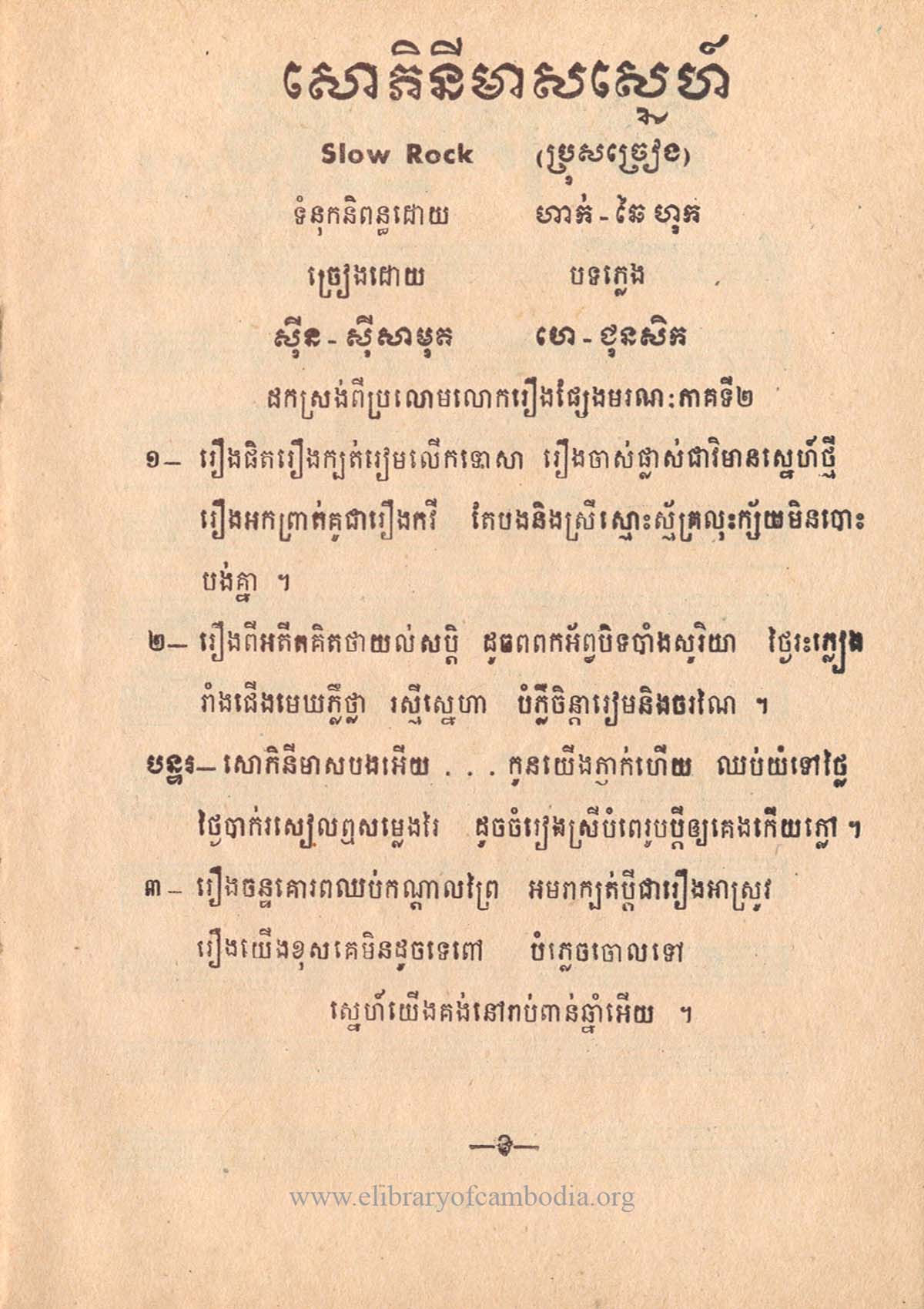 - យើងមានអត្ថបទ និងអក្សរភ្លេង ដកស្រង់ចេញពីសៀវភៅ ចម្រៀងខ្ញុំសែនពេញចិត្ត-សោភីនីមាសស្នេហ៍ ទំព័រទី ២ និង ៣