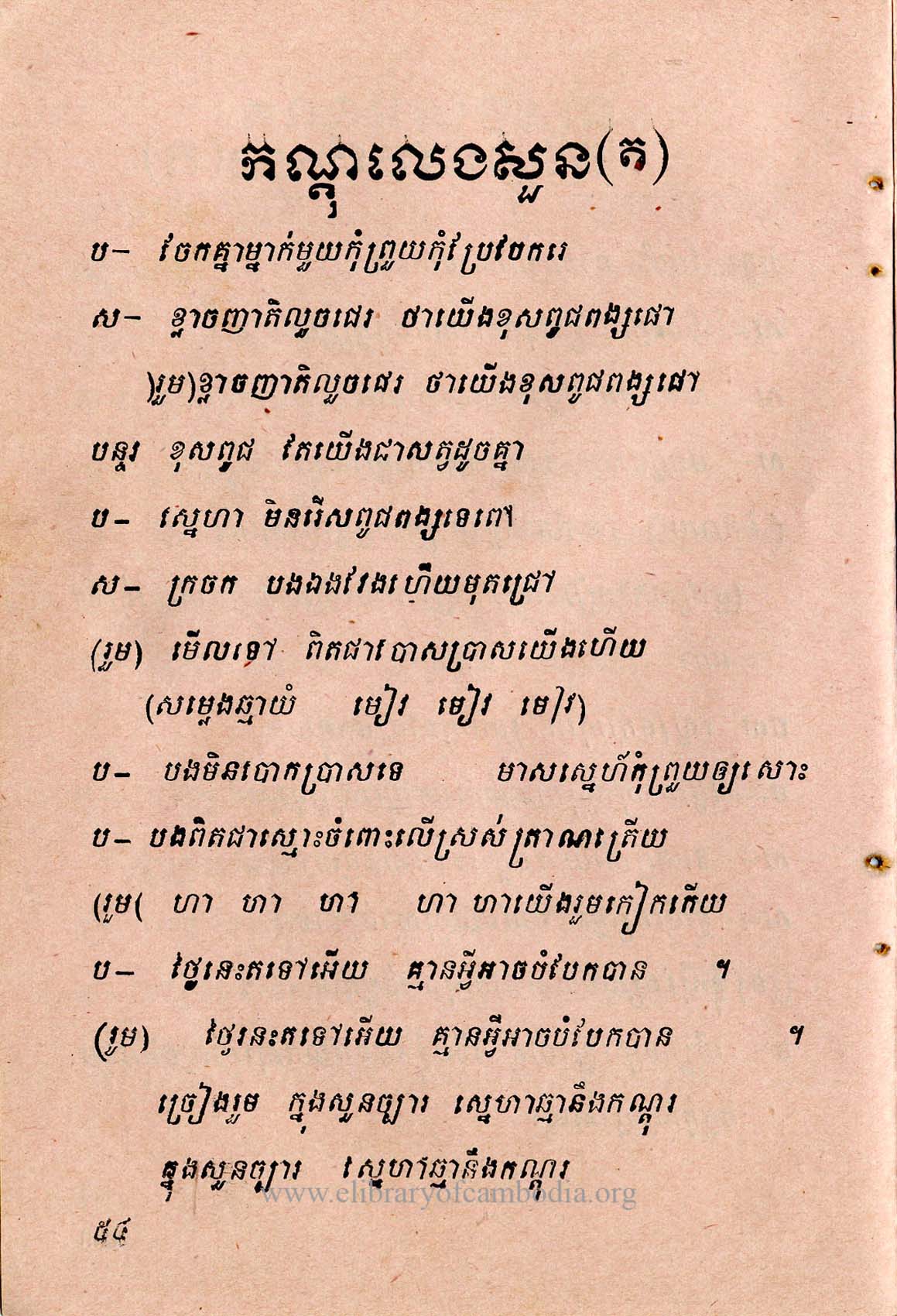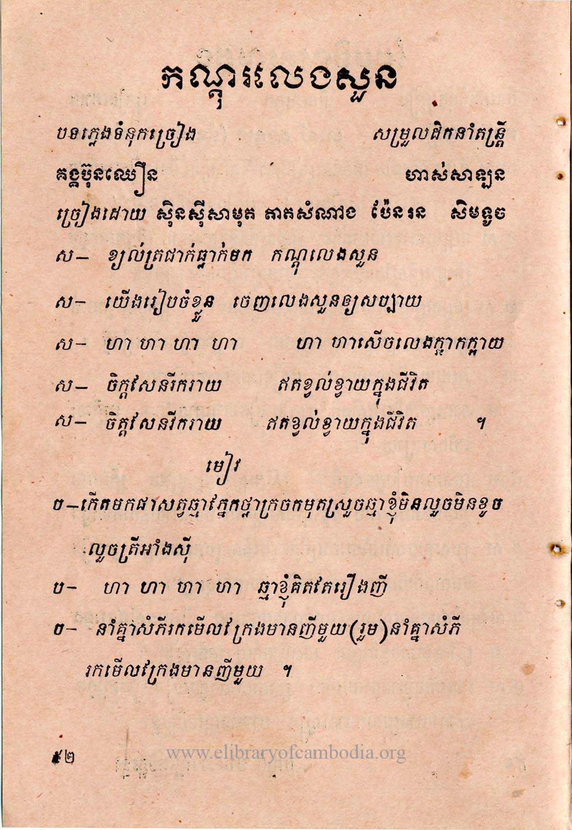 ១ – (ស) ខ្យល់ត្រជាក់ធ្លាក់មក កណ្តុរនាំគ្នាលេងសួន យើងរៀបចំខ្លួន ចេញលេងសួនឱ្យសប្បាយ ហ៎ា ហ៎ា ហ៎ា ហា៎ ហ៎ា ហ៎ាសើចលេងក្អាកក្អាយ ចិត្តសែនរីករាយ ឥតខ្វល់ខ្វាយក្នុងជីវី