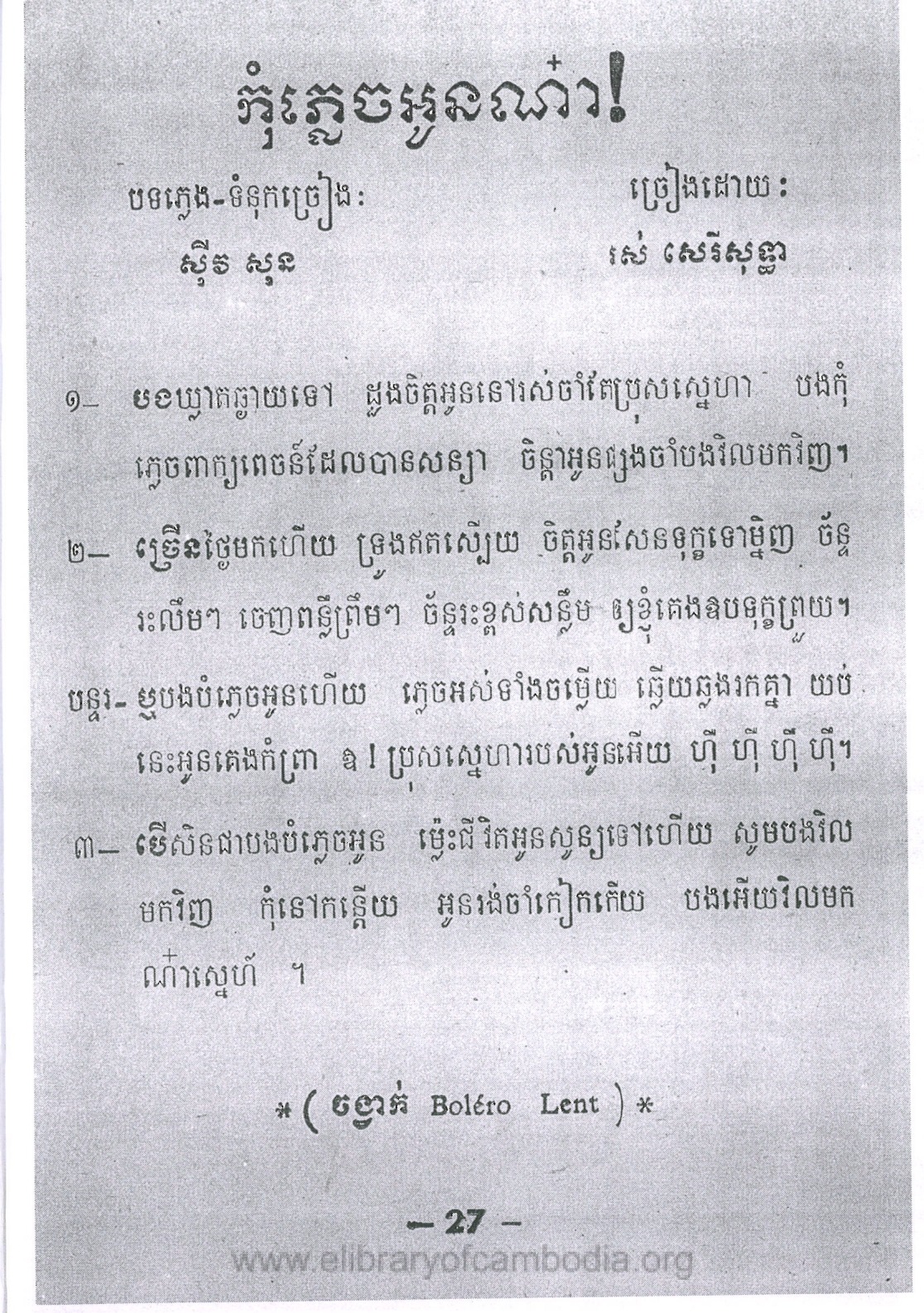 • កុំភ្លេចអូនណា! ចេញផ្សាយនៅលើសៀវភៅចម្រៀង សម្លេងពិរោះ - កុំភ្លេចអូនណា! - ទំព័រ២៧