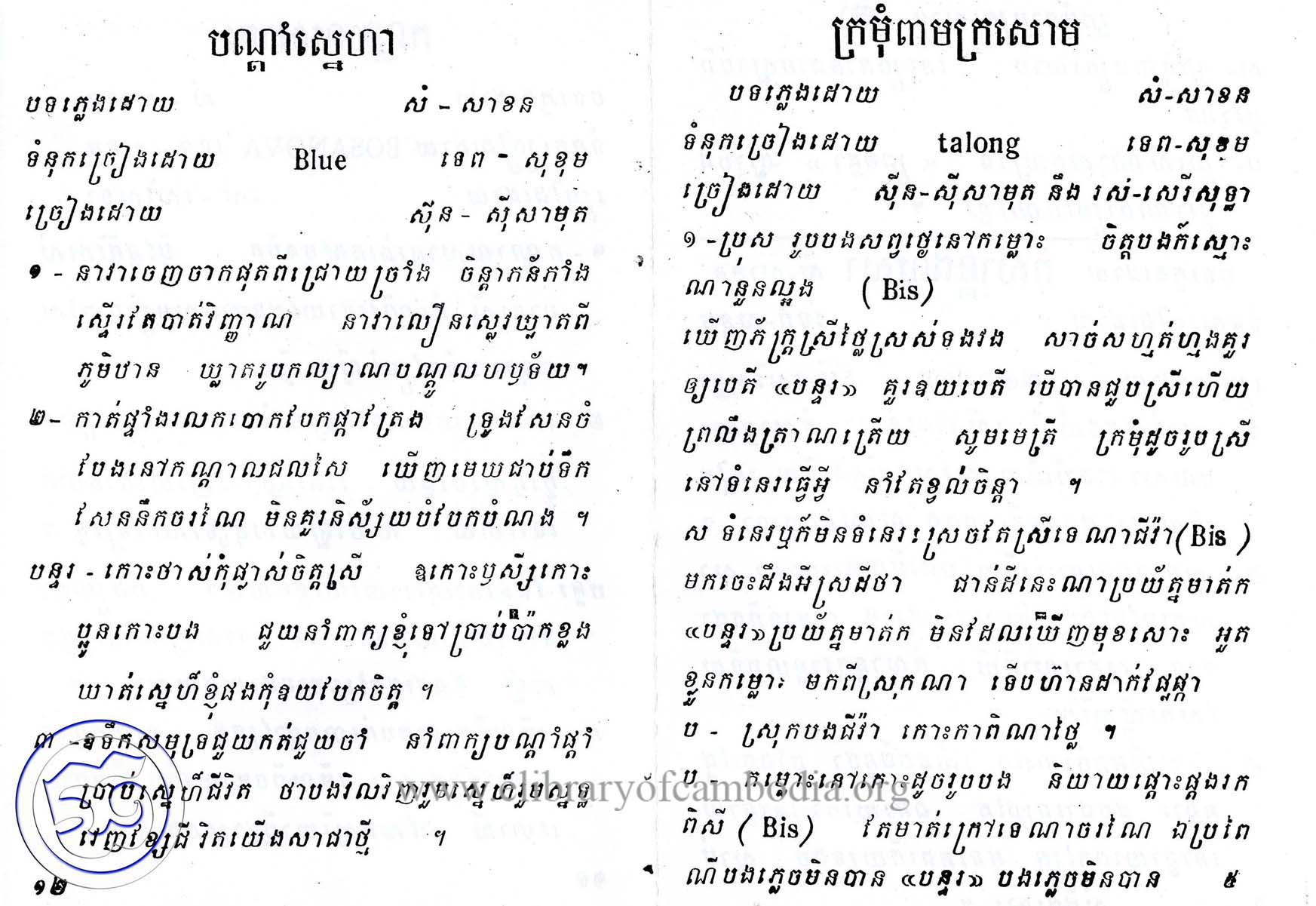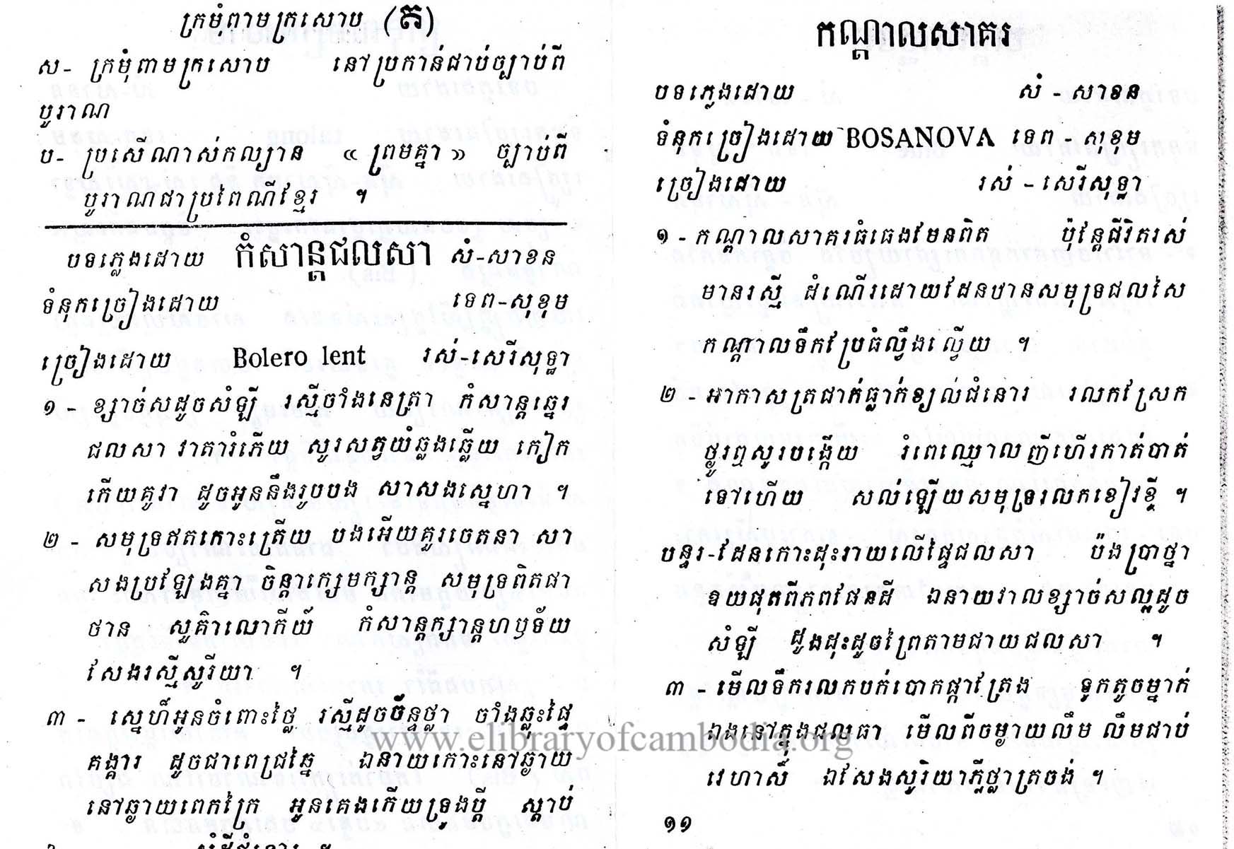 - យើងមានអក្សរភ្លេង ដកស្រង់ចេញពីសៀវភៅ អនុស្សាវរីយ៏ផ្ទៃសមុទ្រខ្មែរ ទី១-(A)បណ្ដាំស្នេហា-(B)ក្រមុំពាមក្រសោម ទំព័រ១១និង ១២
