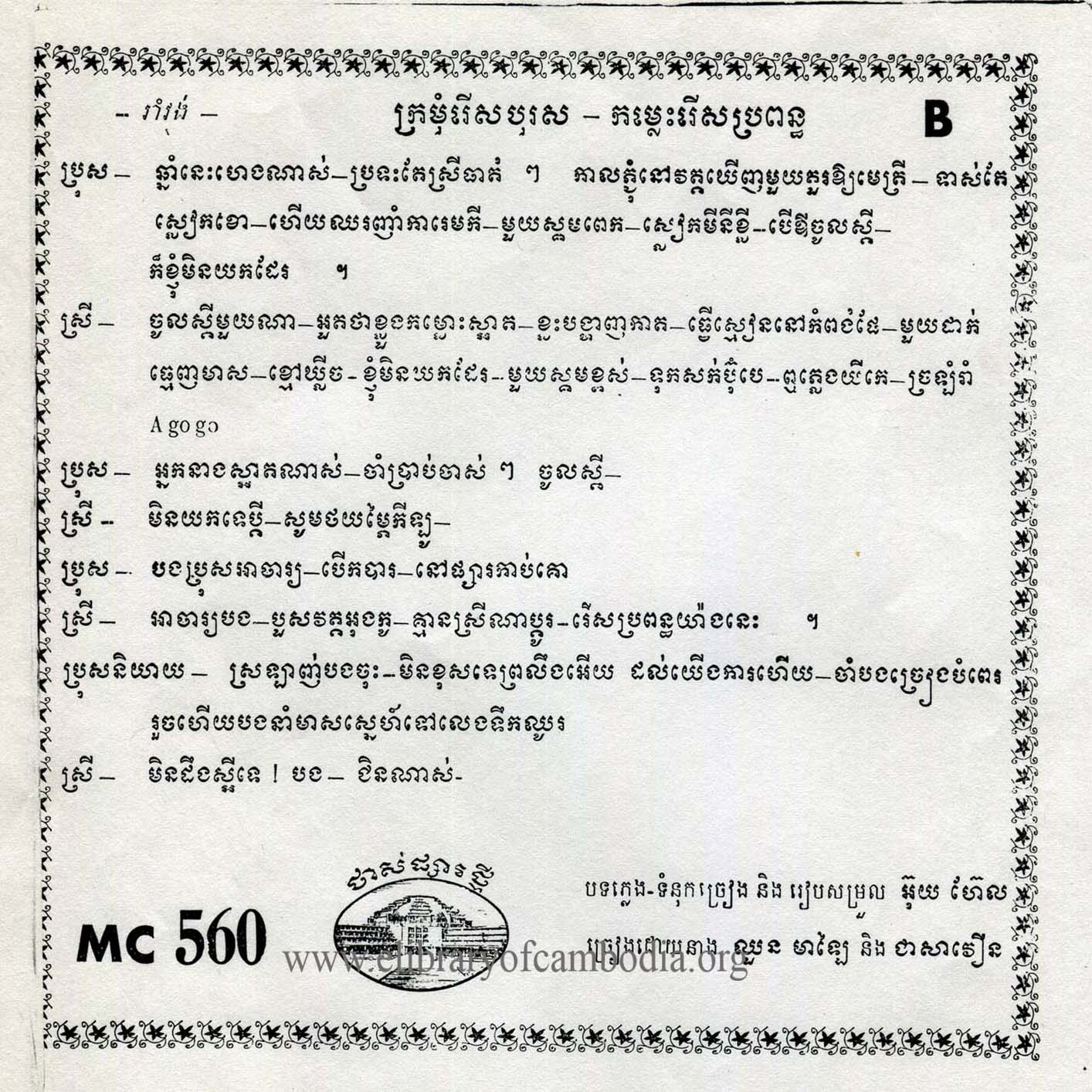 • ចេញផ្សាយជាថាស (Vinyl) ដោយក្រុមហ៊ុន ថាសផ្សារថ្មី (MC-560) - (A) ល្មមភ្ញាក់ខ្លូនហើយបង - (B) ក្រមុំរើសបុរសកម្លោះរើសប្រពន្ធ - (ក្របមុខ - ក្របក្រោយ)