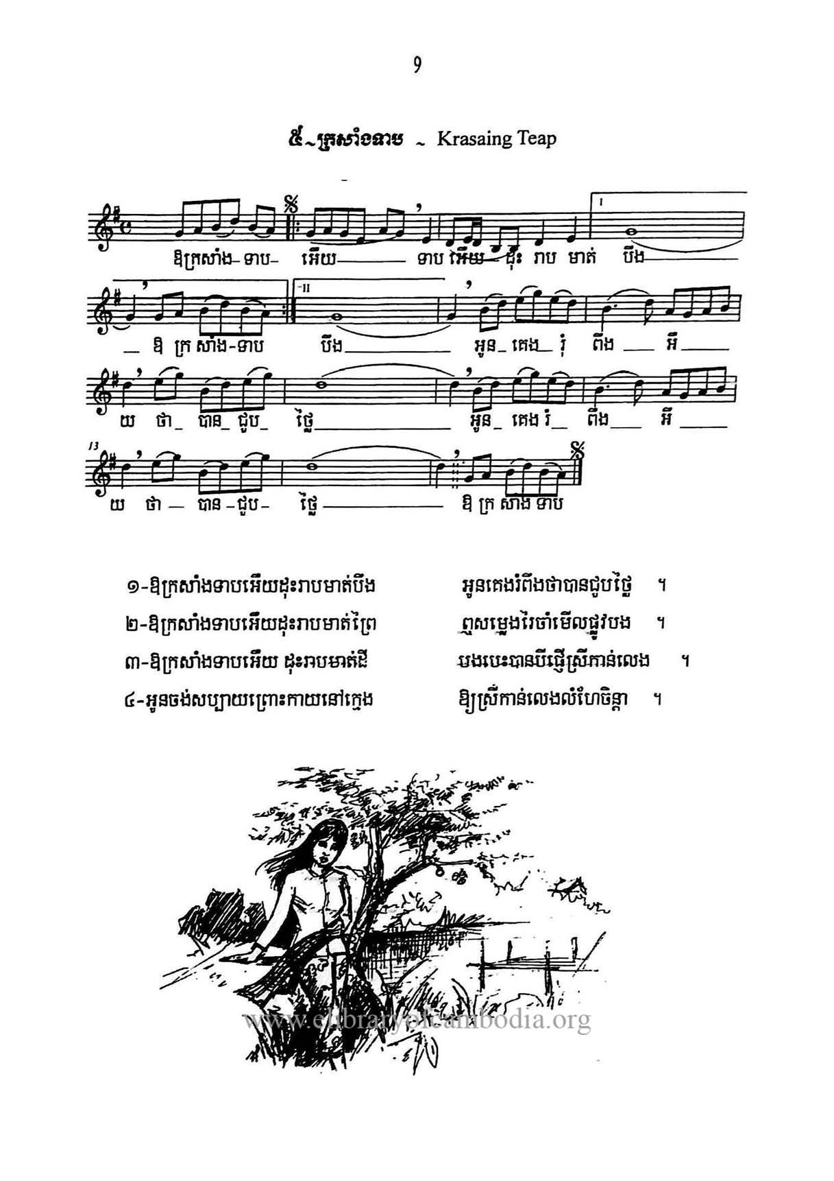 - ចេញផ្សាយនៅលើសៀវភៅចម្រៀង ចំរៀងបុរាណខ្មែរ - ក្រសាំងទាប - អត្ថបទ និង អក្សរភ្លេង