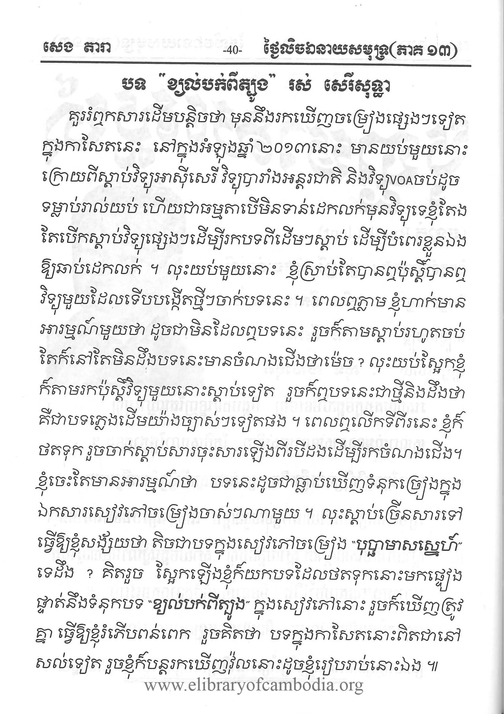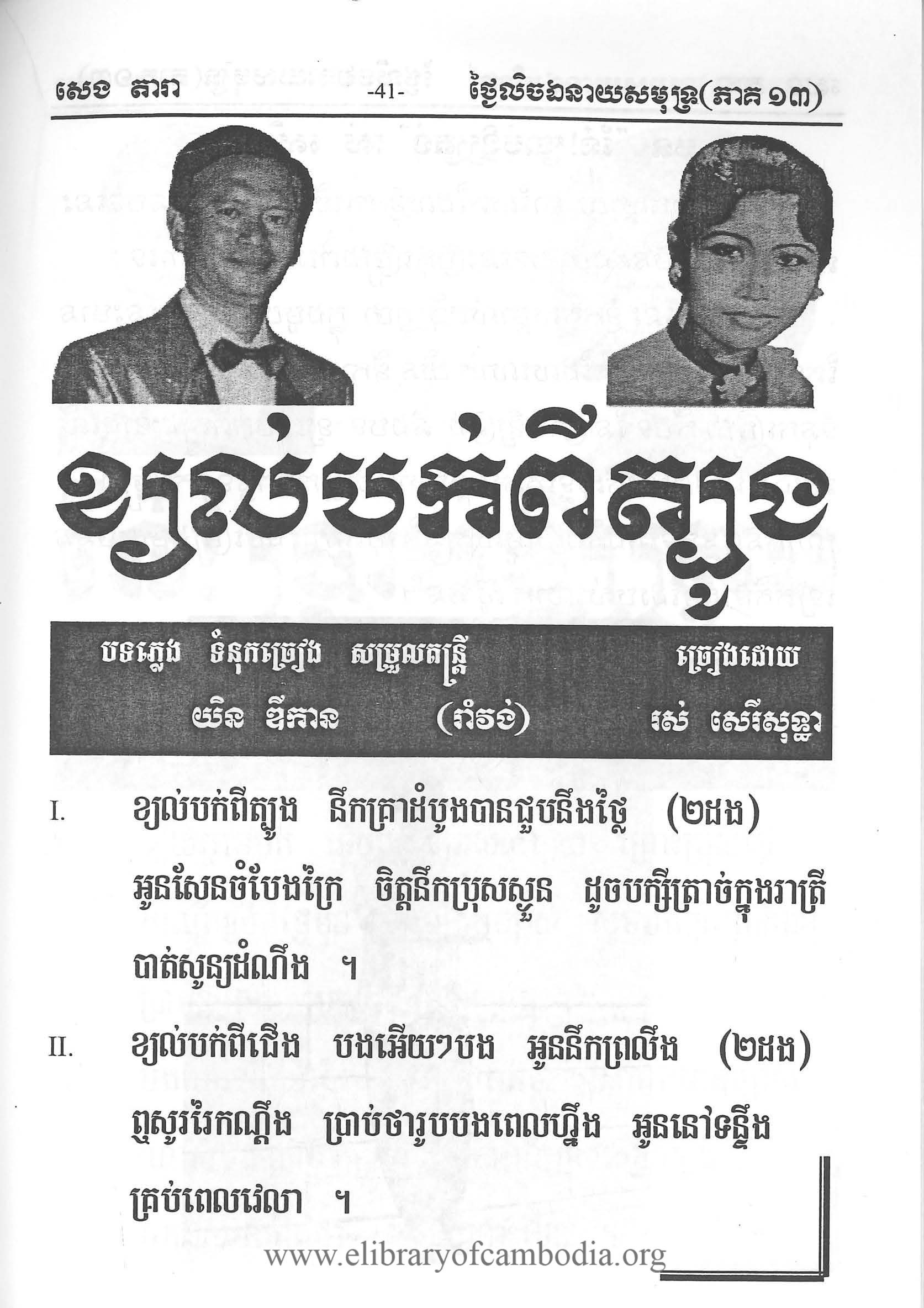 យើងខ្ញុំមានបំណងរក្សាសម្បត្តិខ្មែរទុកនៅលើគេហទំព័រ www.elibraryofcambodia.org នេះ ព្រមទាំងផ្សព្វផ្សាយសម្រាប់បម្រើជាប្រយោជន៍សាធារណៈ ដោយឥតគិតរក និងយកកម្រៃ នៅមុនថ្ងៃទី១៧ ខែមេសា ឆ្នាំ១៩៧៥ ចម្រៀងខ្មែរបានថតផ្សាយលក់លើថាសចម្រៀង 45 RPM 33 ½ RPM 78 RPM ដោយផលិតកម្ម ថាស កណ្ដឹងមាស ឃ្លាំងមឿង ចតុមុខ ហេងហេង សញ្ញាច័ន្ទឆាយា នាគមាស បាយ័ន ផ្សារថ្មី ពស់មាស ពែងមាស ភួងម្លិះ ភ្នំពេជ្រ គ្លិស្សេ ភ្នំពេញ ភ្នំមាស មណ្ឌលតន្រ្តី មនោរម្យ មេអំបៅ រូបតោ កាពីតូល សញ្ញា វត្តភ្នំ វិមានឯករាជ្យ សម័យអាប៉ូឡូ សាឃូរ៉ា ខ្លាធំ សិម្ពលី សេកមាស ហង្សមាស ហនុមាន ហ្គាណេហ្វូ អង្គរ Lac Sea សញ្ញា អប្សារា អូឡាំពិក កីឡា ថាសមាស ម្កុដពេជ្រ មនោរម្យ បូកគោ ឥន្ទ្រី Eagle ទេពអប្សរ ចតុមុខ ឃ្លោកទិព្វ ខេមរា មេខ្លា សាកលតន្ត្រី មេអំបៅ Diamond Columbo ហ្វីលិព Philips EUROPASIE EP ដំណើរខ្មែរ ទេពធីតា មហាធូរ៉ា ជាដើម។
