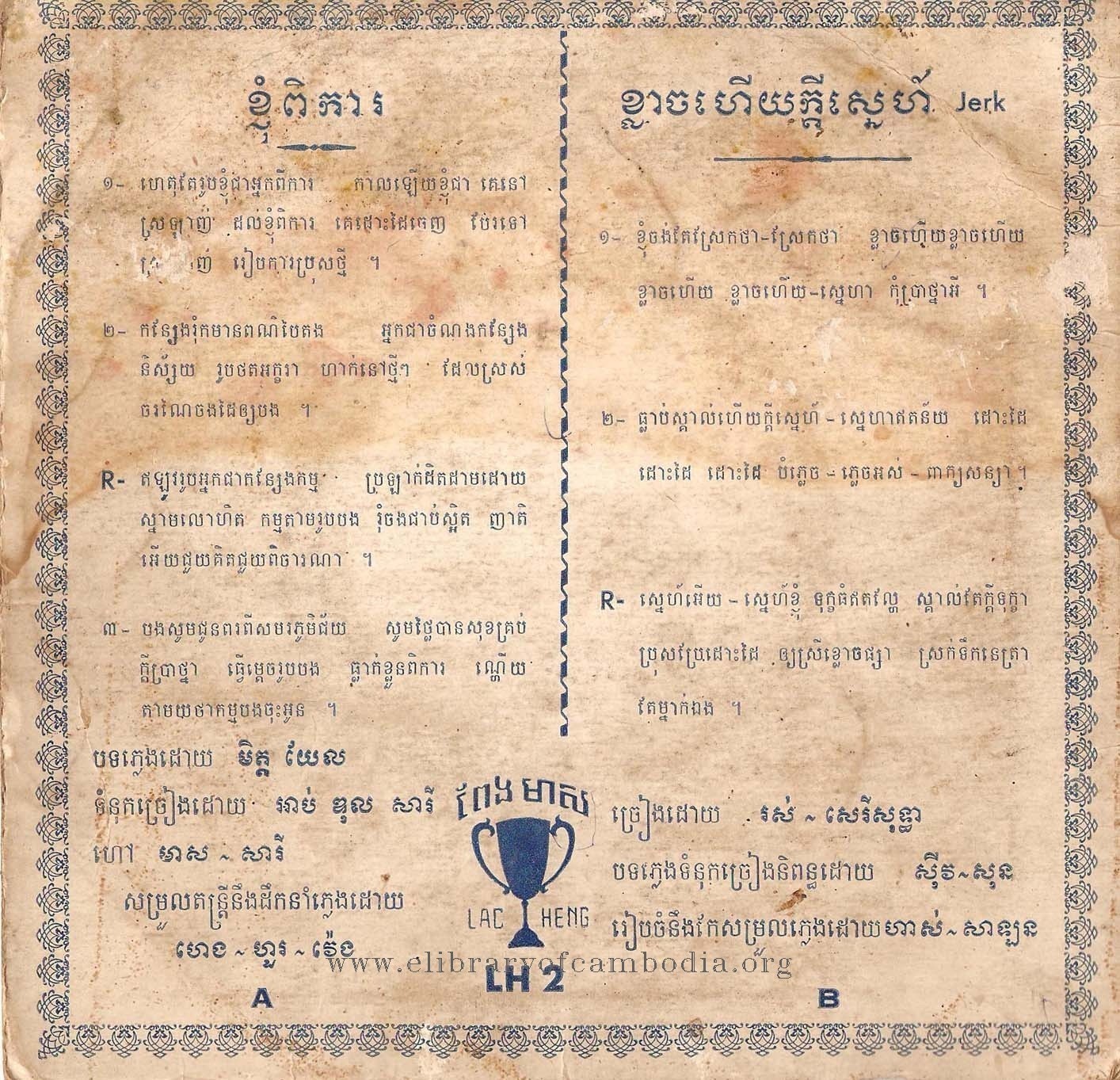 - ចេញផ្សាយជាថាស (Vinyl) ដោយផលិតកម្ម ពែងមាស (LH 2) - (A) ខ្ញុំពិការ - (B) ខ្លាចហើយក្តីស្នេហ៍ - ក្របក្រោយ