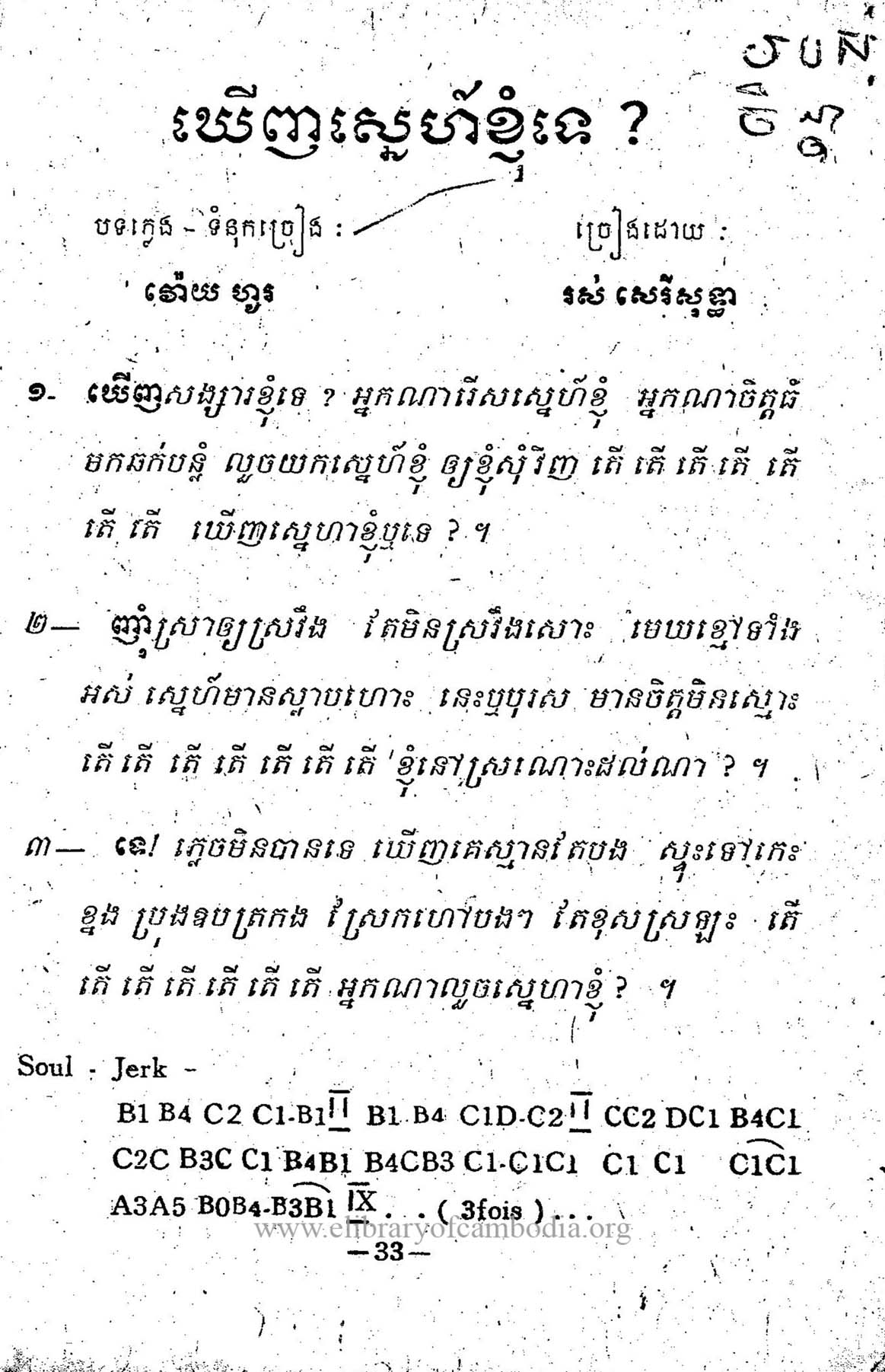 - យើងមានអត្ថបទ និងអក្សរភ្លេង ដកស្រង់ចេញពីសៀវភៅ វ៉ោយ ហូរ លេខ១ - ឃើញស្នេហ៍ខ្ញុំទេ? ទំព័រទី ៣៣