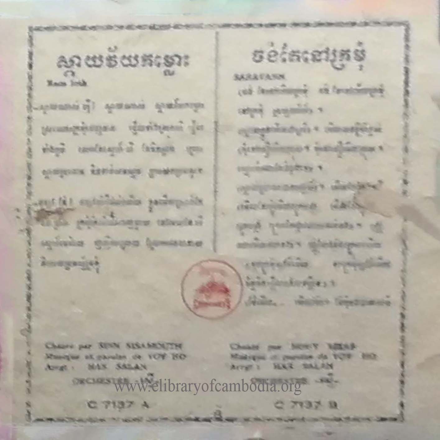 យើងខ្ញុំមានបំណងរក្សាសម្បត្តិខ្មែរទុកនៅលើគេហទំព័រ www.elibraryofcambodia.org នេះ ព្រមទាំងផ្សព្វផ្សាយសម្រាប់បម្រើជាប្រយោជន៍សាធារណៈ ដោយឥតគិតរក និងយកកម្រៃ នៅមុនថ្ងៃទី១៧ ខែមេសា ឆ្នាំ១៩៧៥ ចម្រៀងខ្មែរបានថតផ្សាយលក់លើថាសចម្រៀង 45 RPM 33 ½ RPM 78 RPM ដោយផលិតកម្ម ថាស កណ្ដឹងមាស ឃ្លាំងមឿង ចតុមុខ ហេងហេង សញ្ញាច័ន្ទឆាយា នាគមាស បាយ័ន ផ្សារថ្មី ពស់មាស ពែងមាស ភួងម្លិះ ភ្នំពេជ្រ គ្លិស្សេ ភ្នំពេញ ភ្នំមាស មណ្ឌលតន្រ្តី មនោរម្យ មេអំបៅ រូបតោ កាពីតូល សញ្ញា វត្តភ្នំ វិមានឯករាជ្យ សម័យអាប៉ូឡូ សាឃូរ៉ា ខ្លាធំ សិម្ពលី សេកមាស ហង្សមាស ហនុមាន ហ្គាណេហ្វូ អង្គរ Lac Sea សញ្ញា អប្សារា អូឡាំពិក កីឡា ថាសមាស ម្កុដពេជ្រ មនោរម្យ បូកគោ ឥន្ទ្រី Eagle ទេពអប្សរ ចតុមុខ ឃ្លោកទិព្វ ខេមរា មេខ្លា សាកលតន្ត្រី មេអំបៅ Diamond Columbo ហ្វីលិព Philips EUROPASIE EP ដំណើរខ្មែរ ទេពធីតា មហាធូរ៉ា ជាដើម។