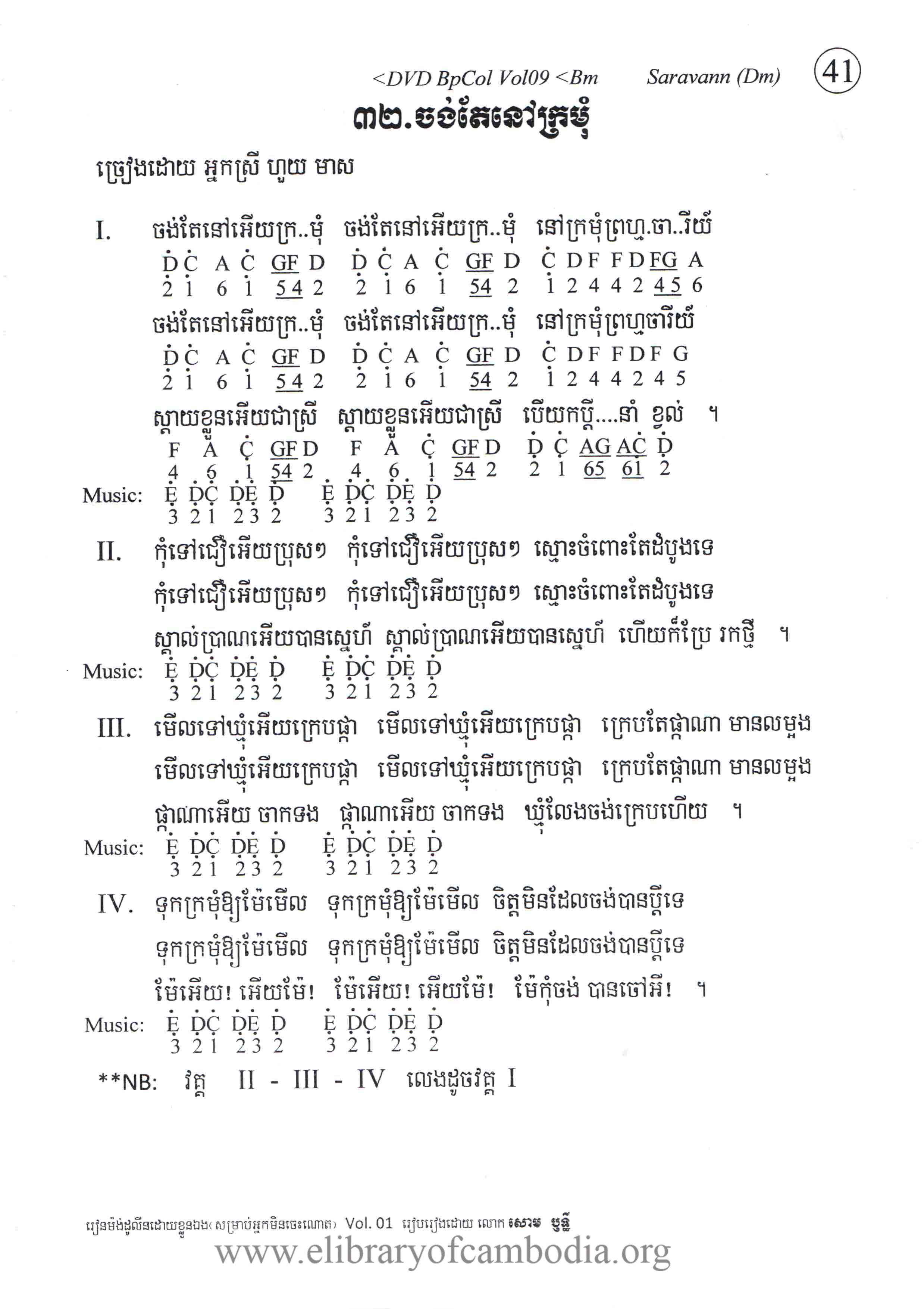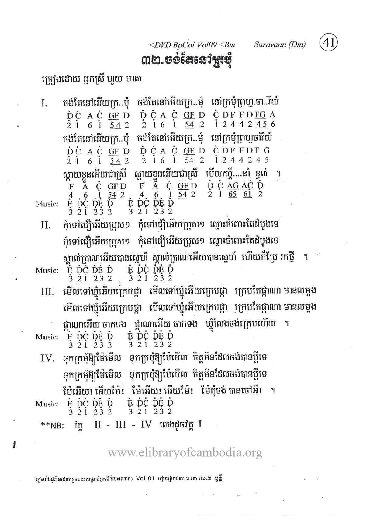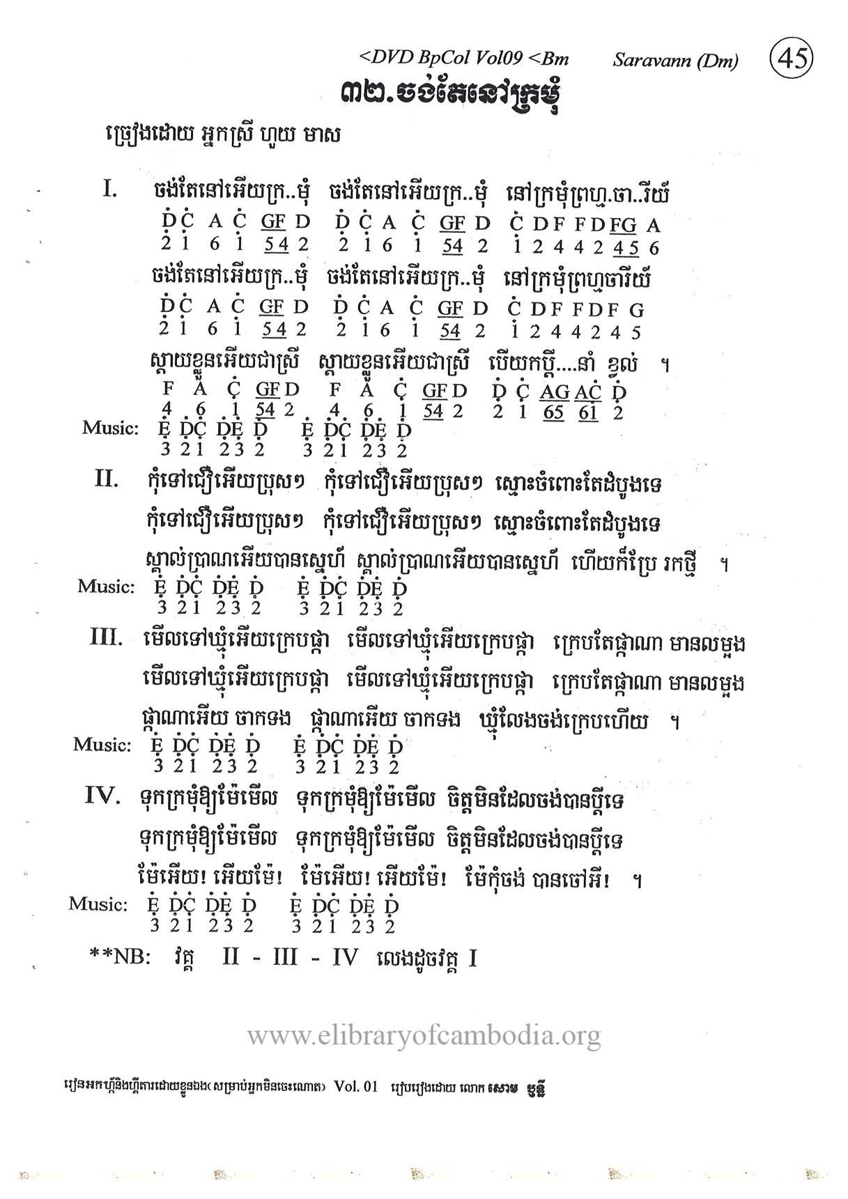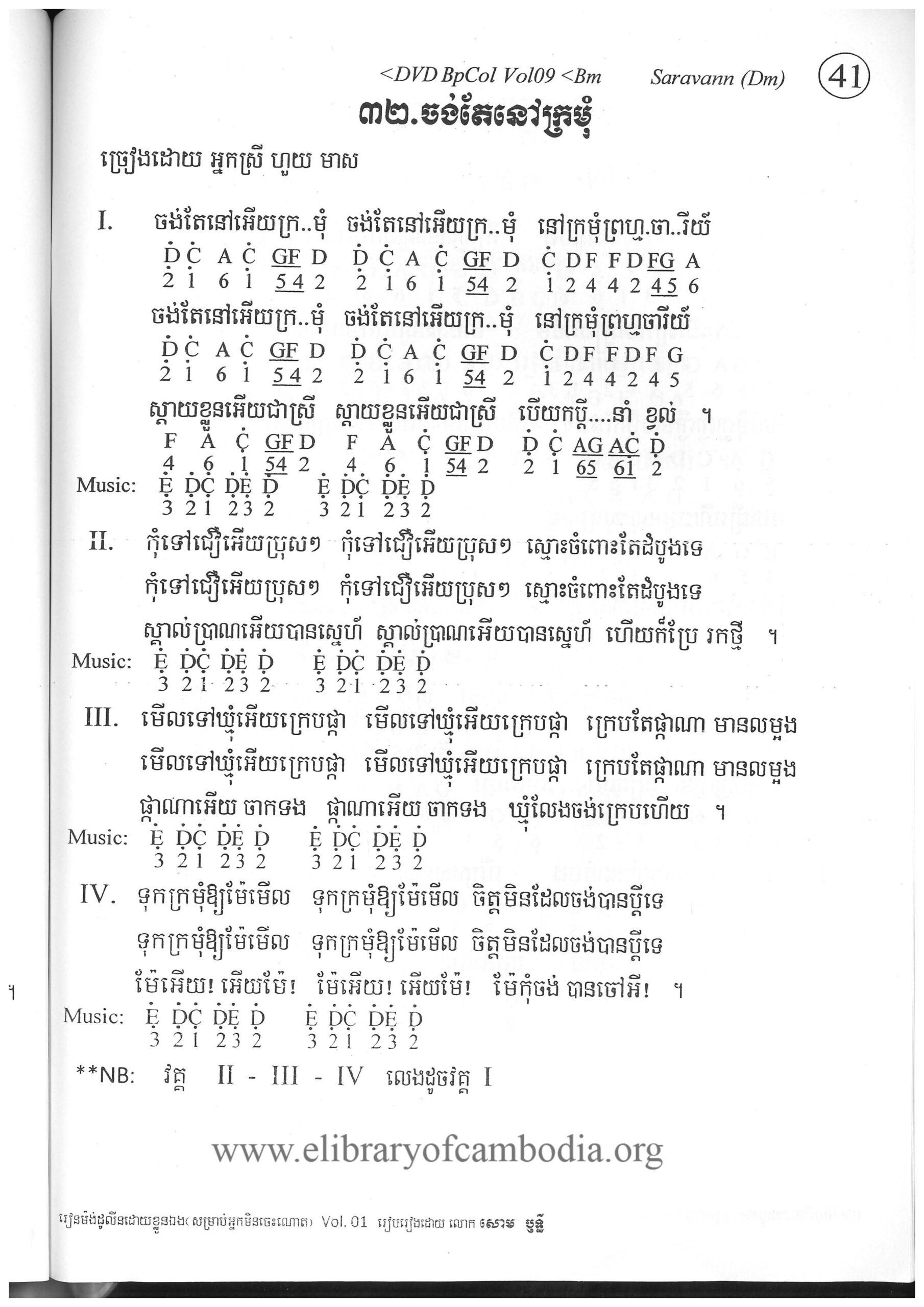 - យើងមានអត្ថបទ និងអក្សរភ្លេង ដកស្រង់ចេញពីសៀវភៅ រៀនលេងតន្រ្តី ណោតងាយស្រួល ភាគ១០-ចង់តែនៅក្រមុំ-អក្សរភ្លេង និងអត្ថបទចម្រៀង