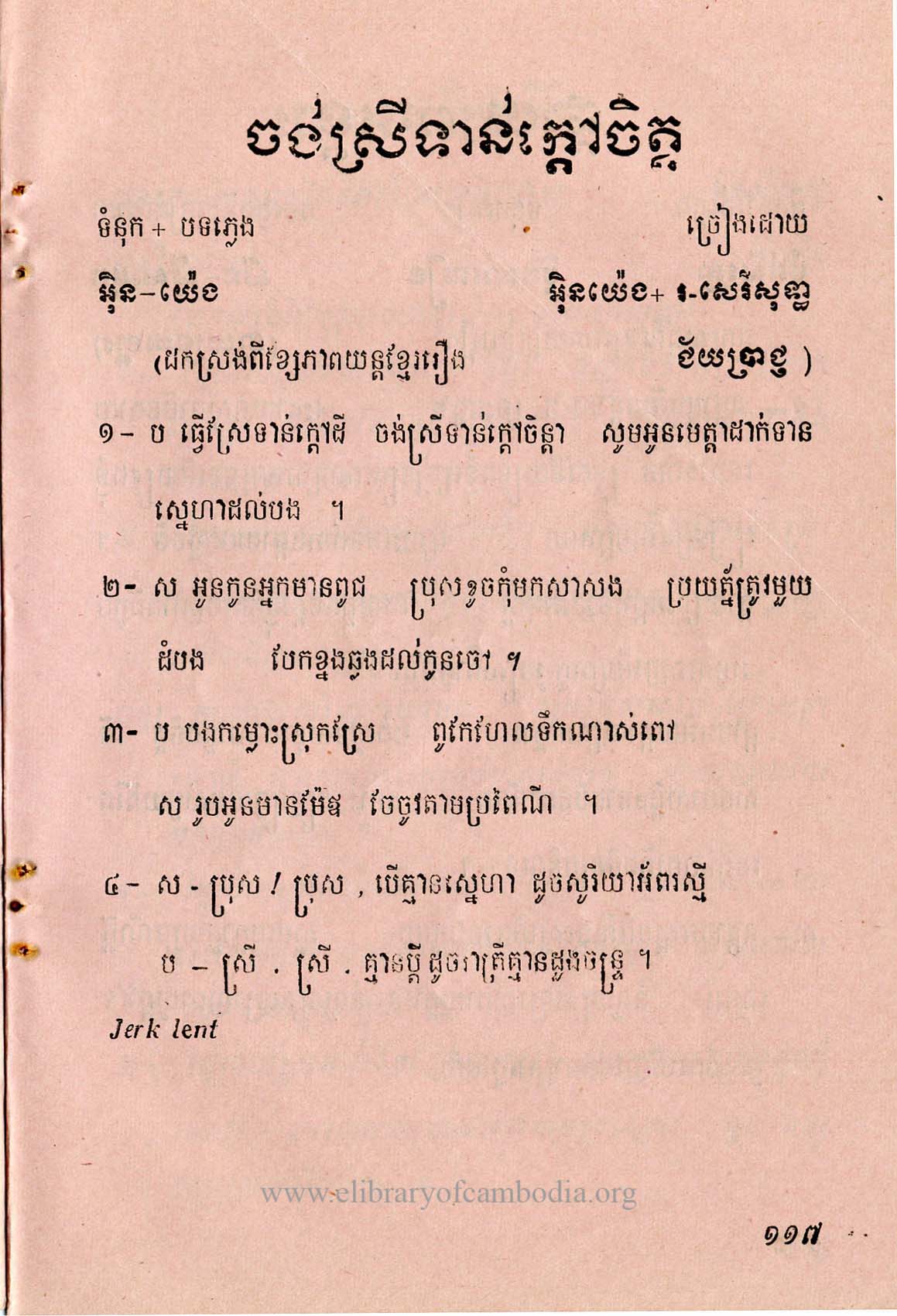 - ចង់ស្រីទាន់ក្ដៅចិត្ត ជាបទចម្រៀងដើម មុនថ្ងៃ១៧ មេសា ១៩៧៥ ច្រៀងដំបូង ដោយ អ៊ិន យ៉េន និង រស់ សេរីសុទ្ធា