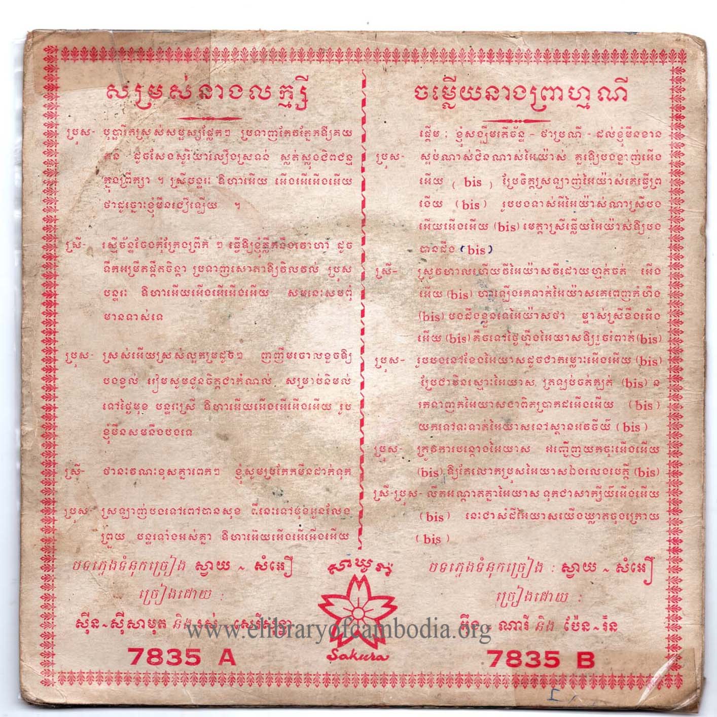 - ចេញផ្សាយជាថាស (Vinyl) ដោយផលិតកម្ម សាឃូរ៉ា (7835) - (A) សម្រស់នាងលក្ស្មី - (B) ចម្លើយនាងព្រាហ្មណី- ថាស - ក្របមុខ - ក្របក្រោយ