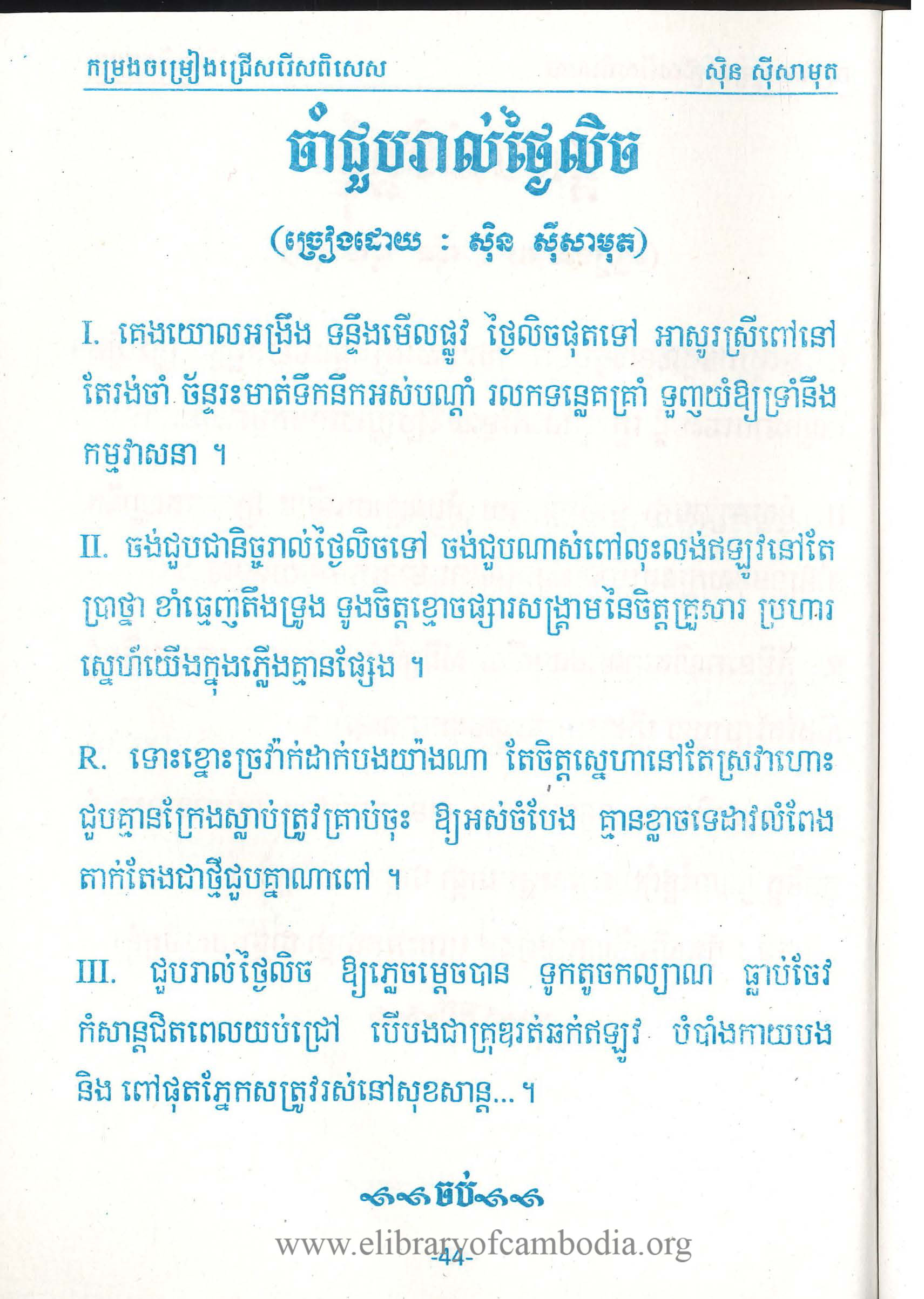 - យើងមានអត្ថបទ និងអក្សរភ្លេង ដកស្រង់ចេញពីសៀវភៅ កម្រងចម្រៀងជ្រើសរើសពិសេស ស៊ីន ស៊ីសាមុត