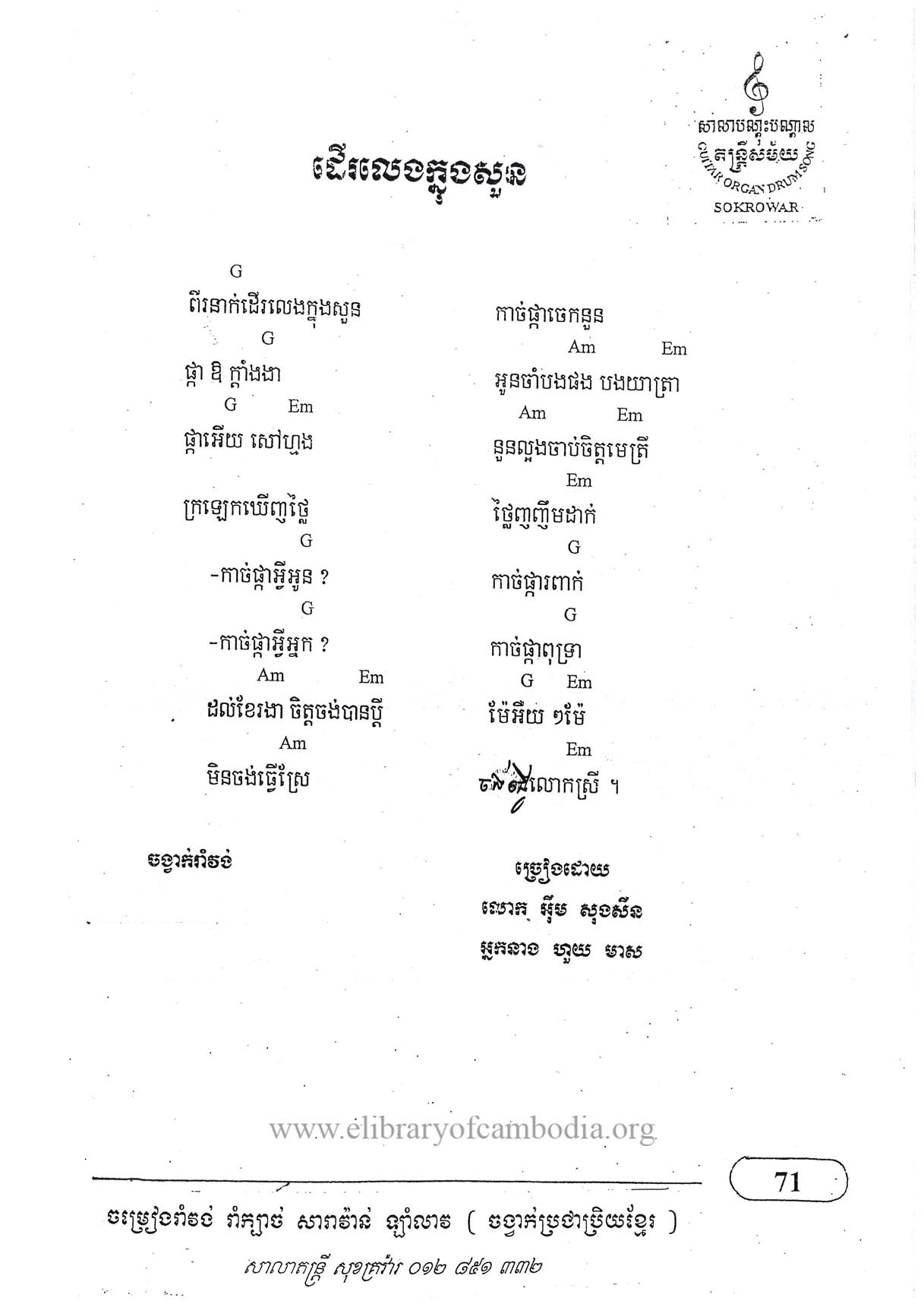 ២ – (ប)ពីរនាក់នែ!ដើរលេងក្នុងសួនកាច់ផ្កាចេកនួនផ្កា ឱ!ក្តាំងងាអូនចាំបងផងបងយាត្រាផ្កាអើយ!សៅហ្មងនួនល្អងចាប់ចិត្ត នែ!មេត្រីក្រឡេកឃើញស្រី ស្រីញញឹមស្រស់ កាច់ផ្កាអ្វីអូន?