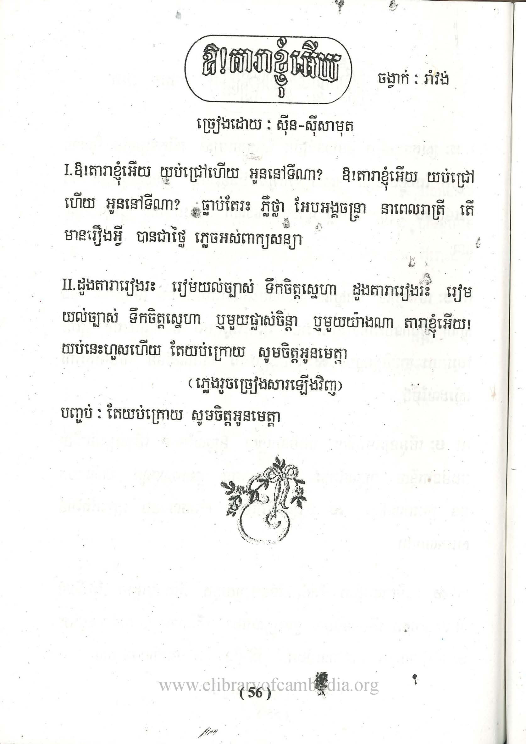យើងខ្ញុំមានបំណងរក្សាសម្បត្តិខ្មែរទុកនៅលើគេហទំព័រ www.elibraryofcambodia.org នេះ ព្រមទាំងផ្សព្វផ្សាយសម្រាប់បម្រើជាប្រយោជន៍សាធារណៈ ដោយឥតគិតរក និងយកកម្រៃ នៅមុនថ្ងៃទី១៧ ខែមេសា ឆ្នាំ១៩៧៥ ចម្រៀងខ្មែរបានថតផ្សាយលក់លើថាសចម្រៀង 45 RPM 33 ½ RPM 78 RPM ដោយផលិតកម្ម ថាស កណ្ដឹងមាស ឃ្លាំងមឿង ចតុមុខ ហេងហេង សញ្ញាច័ន្ទឆាយា នាគមាស បាយ័ន ផ្សារថ្មី ពស់មាស ពែងមាស ភួងម្លិះ ភ្នំពេជ្រ គ្លិស្សេ ភ្នំពេញ ភ្នំមាស មណ្ឌលតន្រ្តី មនោរម្យ មេអំបៅ រូបតោ កាពីតូល សញ្ញា វត្តភ្នំ វិមានឯករាជ្យ សម័យអាប៉ូឡូ សាឃូរ៉ា ខ្លាធំ សិម្ពលី សេកមាស ហង្សមាស ហនុមាន ហ្គាណេហ្វូ អង្គរ Lac Sea សញ្ញា អប្សារា អូឡាំពិក កីឡា ថាសមាស ម្កុដពេជ្រ មនោរម្យ បូកគោ ឥន្ទ្រី Eagle ទេពអប្សរ ចតុមុខ ឃ្លោកទិព្វ ខេមរា មេខ្លា សាកលតន្ត្រី មេអំបៅ Diamond Columbo ហ្វីលិព Philips EUROPASIE EP ដំណើរខ្មែរ ទេពធីតា មហាធូរ៉ា ជាដើម។