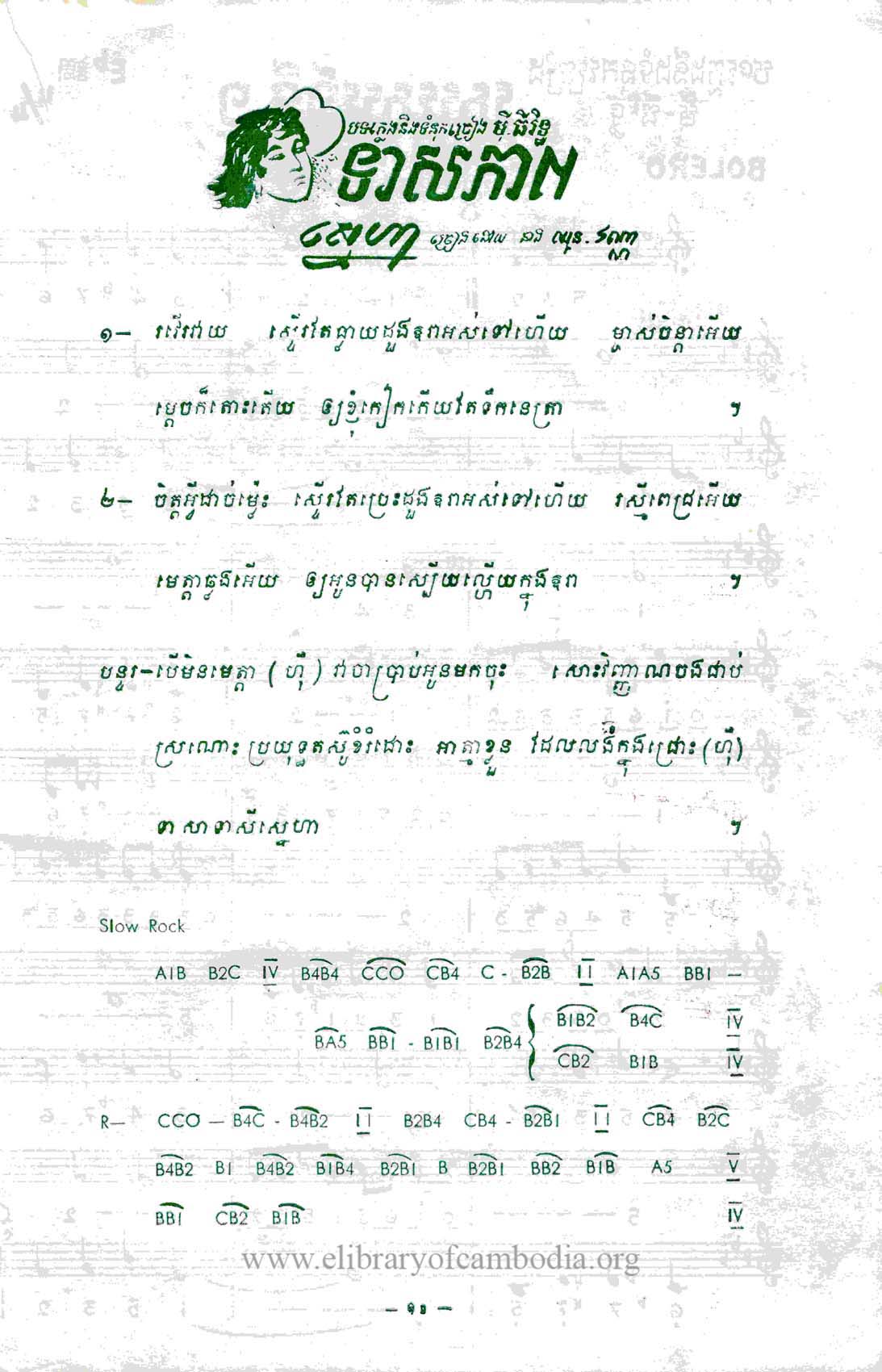 - ចេញផ្សាយនៅលើសៀវភៅចម្រៀង តន្ត្រីវិទ្យុជាតិ - ទាសភាពស្នេហា - អក្សរភ្លេង - ក្របមុខ - ក្របក្រោយ