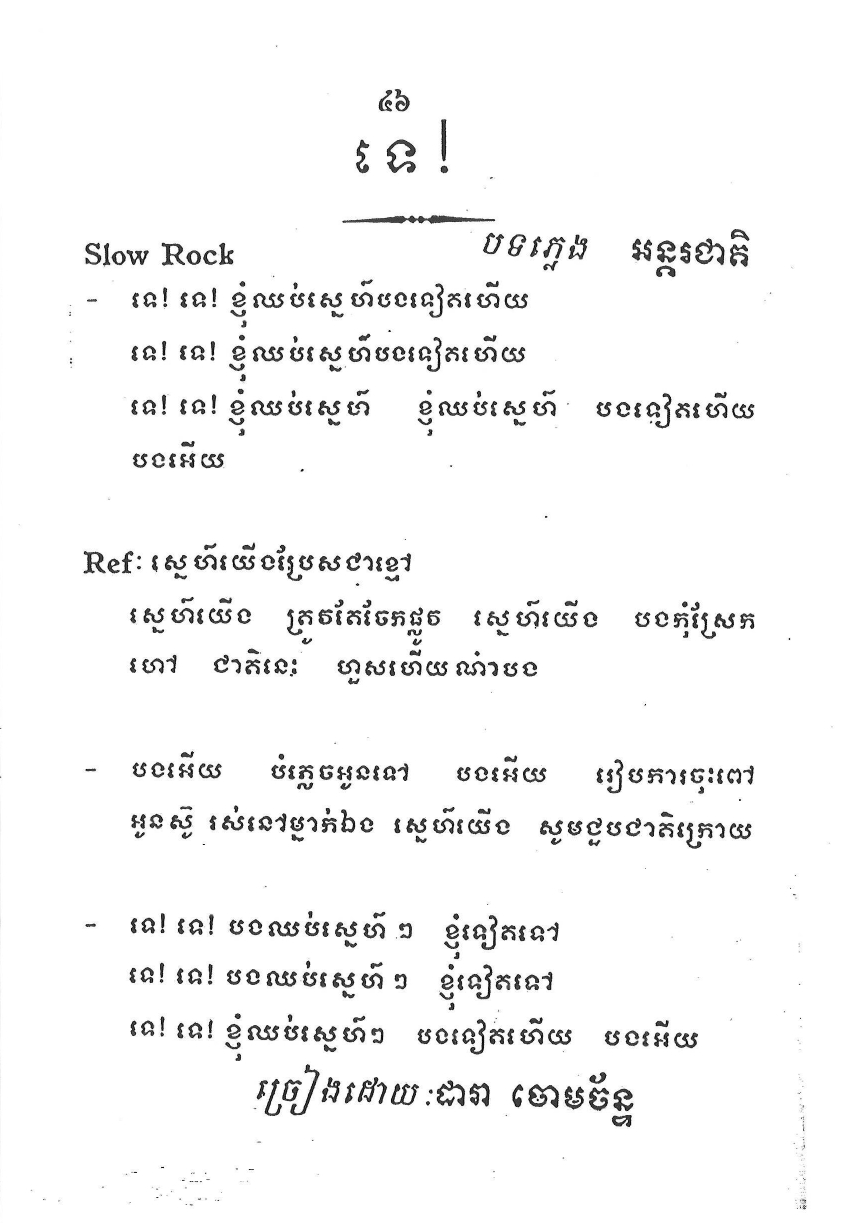 - យើងមានអត្ថបទ ដកស្រង់ចេញពីសៀវភៅ កម្រងចំរៀងជ្រើសរើសប្រជុំបទល្បីៗនាអតីតកាល ទំព័រទី៤៦