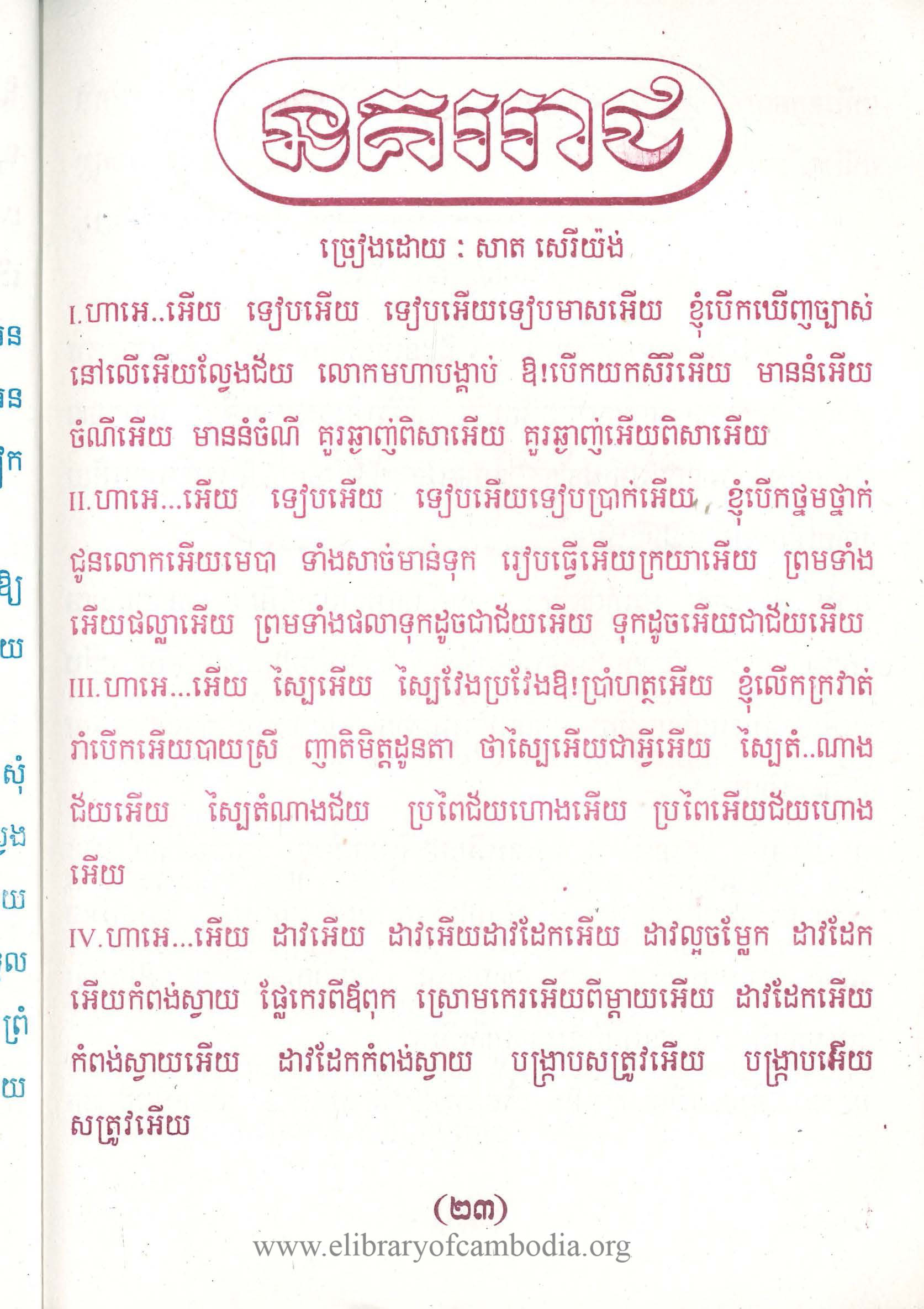- យើងមានអត្ថបទ និងអក្សរភ្លេង ដកស្រង់ចេញពីសៀវភៅ ចំរៀងជ្រើសរើសពិសេស ភ្លេងការ-នគររាជ ទំព័ទី២៣