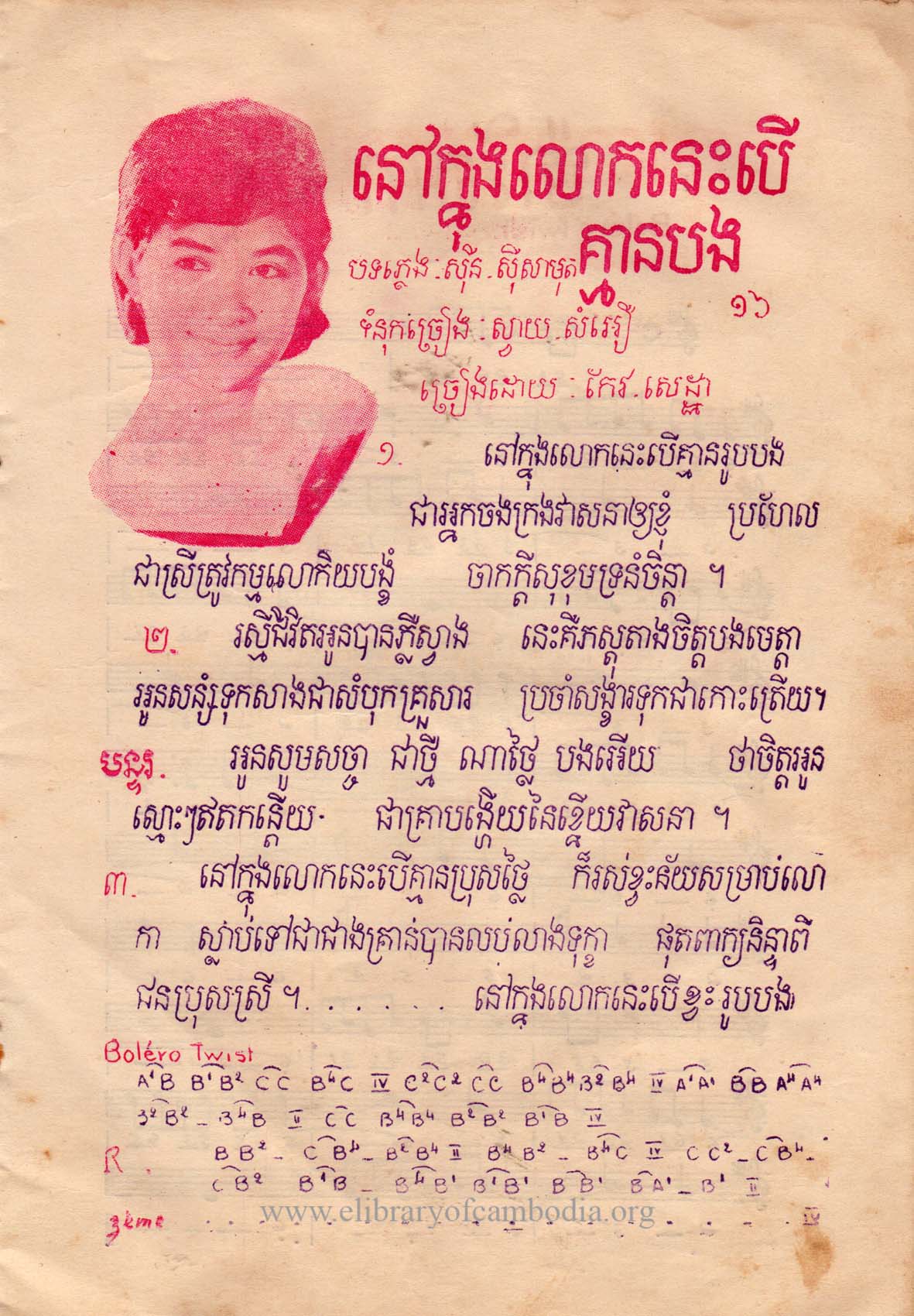 - យើងមានអត្ថបទ និងអក្សរភ្លេង ដកស្រង់ចេញពីសៀវភៅ ចំរៀងពិសេសតន្រ្តីវត្តភ្នុំ - ក្នុងលោកនេះបើគ្មានបង ទំព័ទី១៦