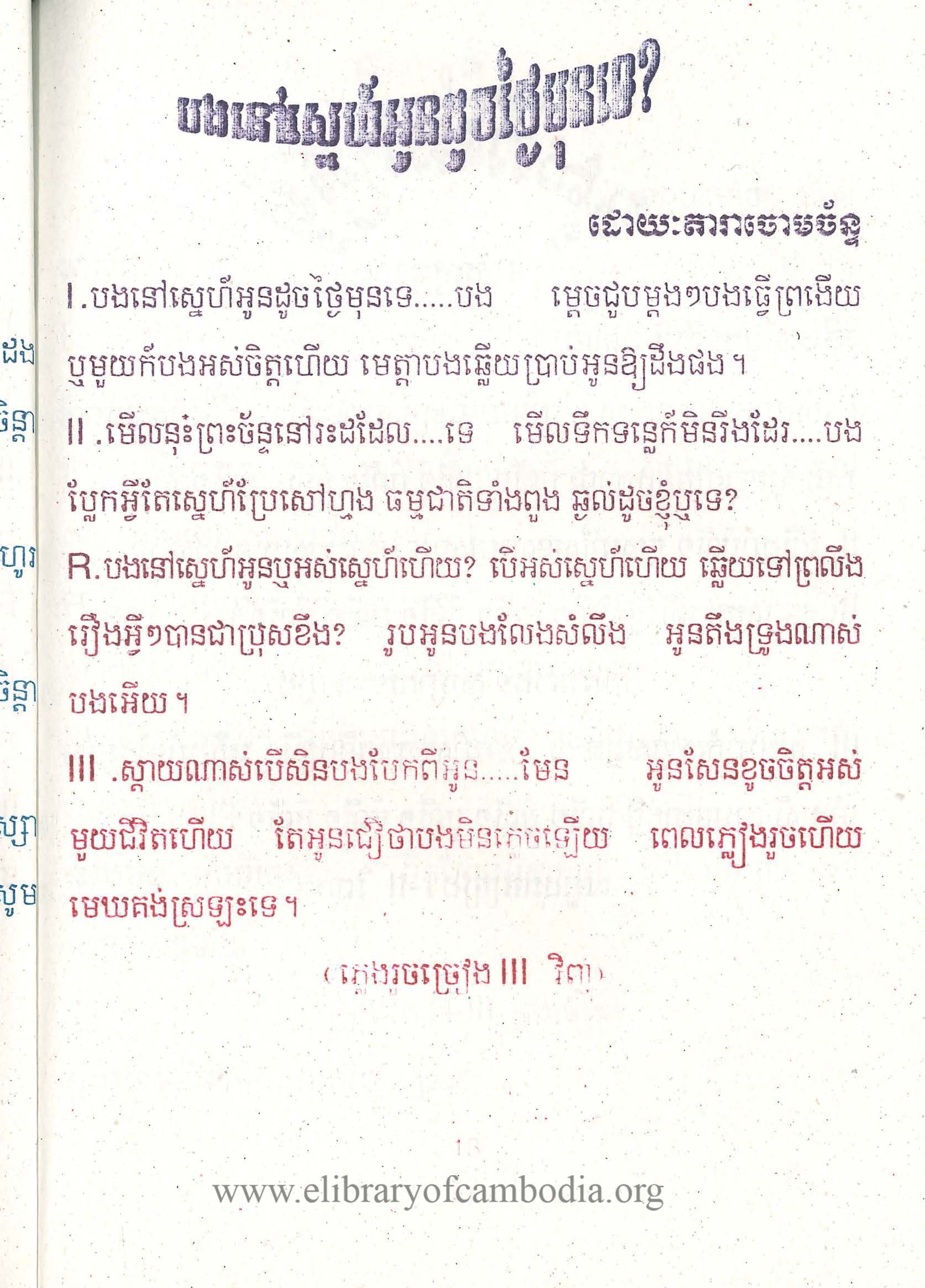 - យើងមានអត្ថបទ ដកស្រង់ចេញពីសៀវភៅ កម្រងចំរៀងជ្រើសរើសប្រជុំបទល្បីៗនាអតីតកាល- បងនៅស្នេហ៍អូនដូចថ្ងៃមុនទេ