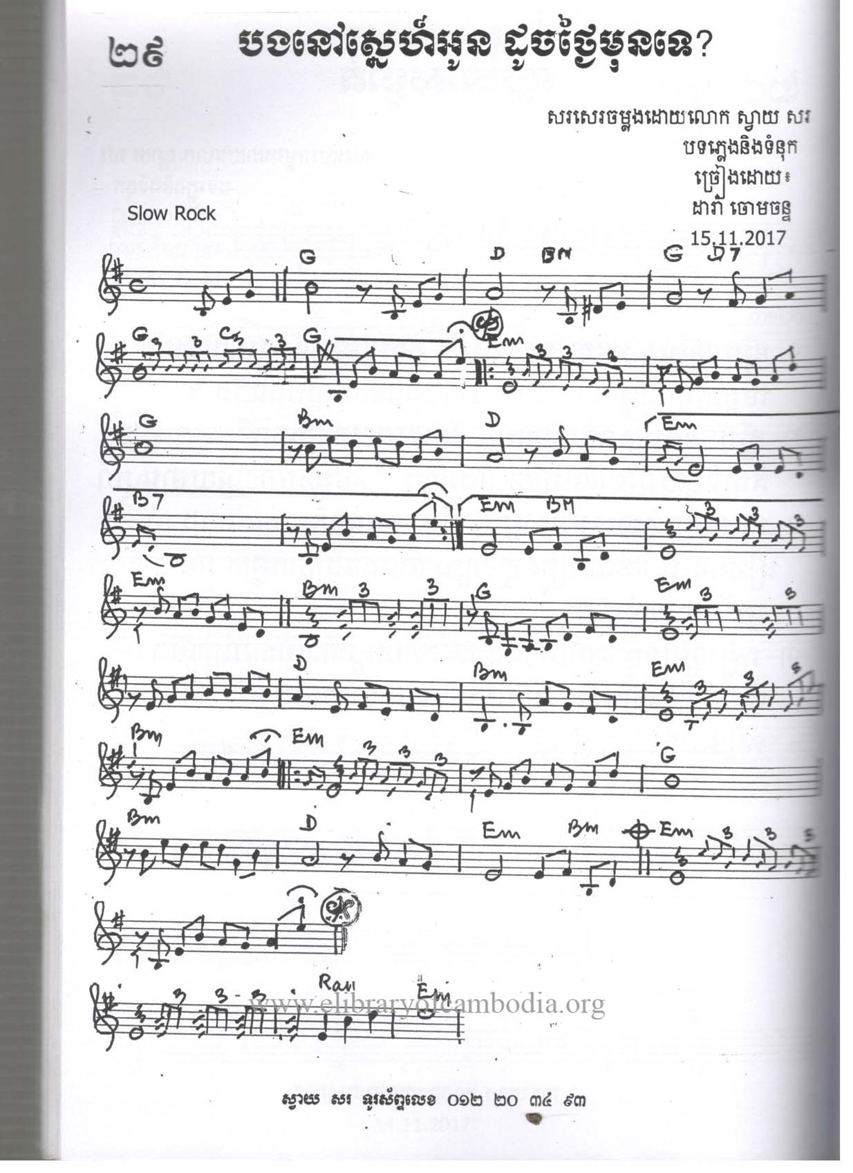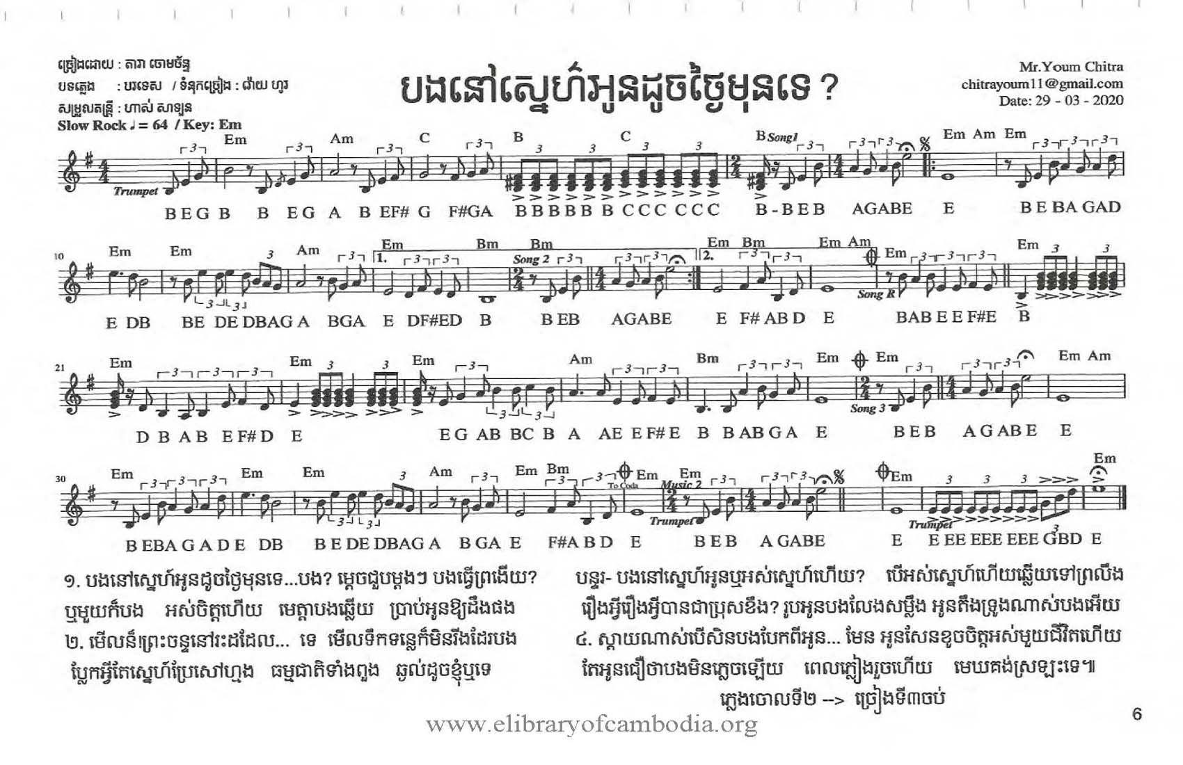 - យើងមានអត្ថបទ និងអក្សរភ្លេង ដកស្រង់ចេញពីសៀវភៅ រៀនលេងព្យ៉ាណូ ណោតងាយស្រួល ភាគទី៧-បងនៅស្នេហ៍អូនដូចថ្ងៃមុនទេ-អត្ថបទចម្រៀង និងអក្សរភ្លេង ទំព័រទី ៦