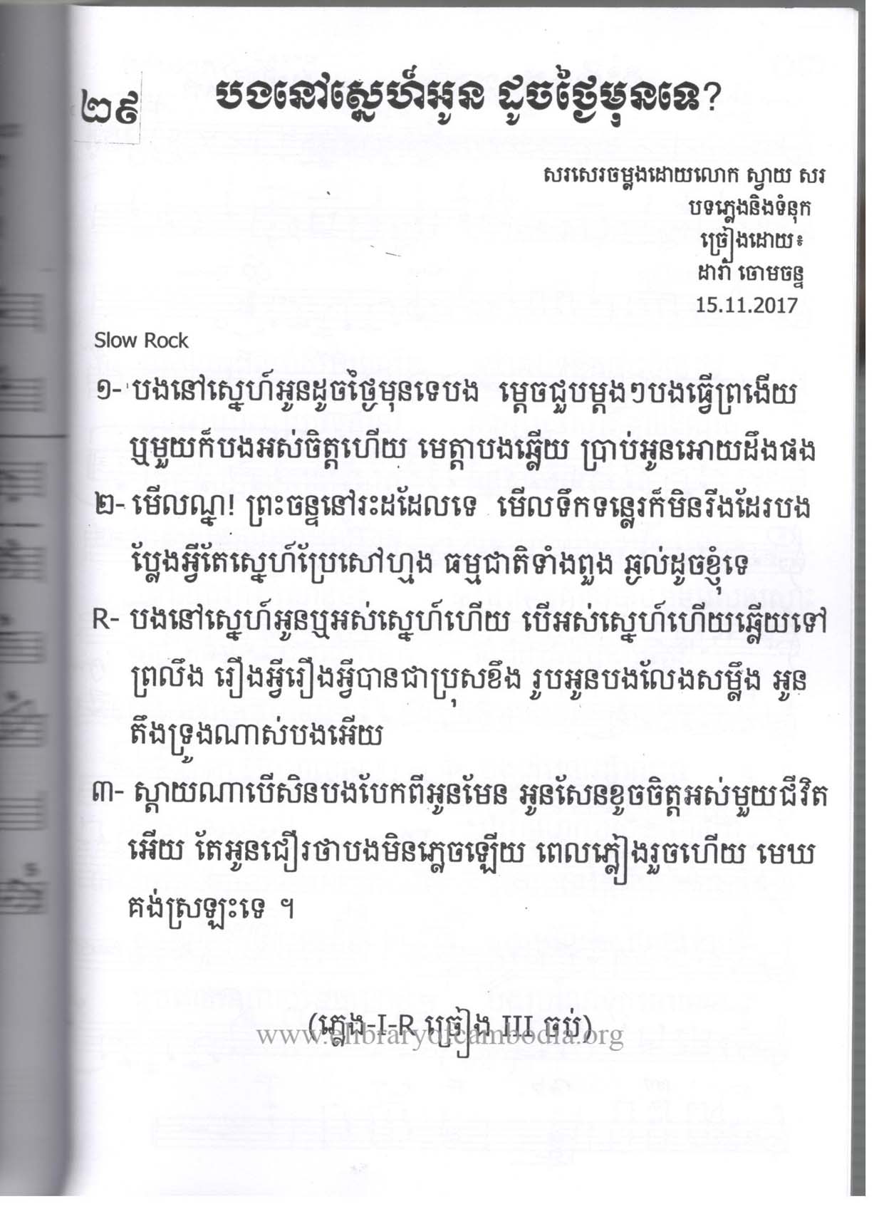 - យើងមានអត្ថបទ និងអក្សរភ្លេង ដកស្រង់ចេញពីសៀវភៅ មរតចម្រៀងភាគ ៣- បងនៅស្នេហ៍អូនដូចថ្ងៃមុនទេ ទំព័រទី ២៩