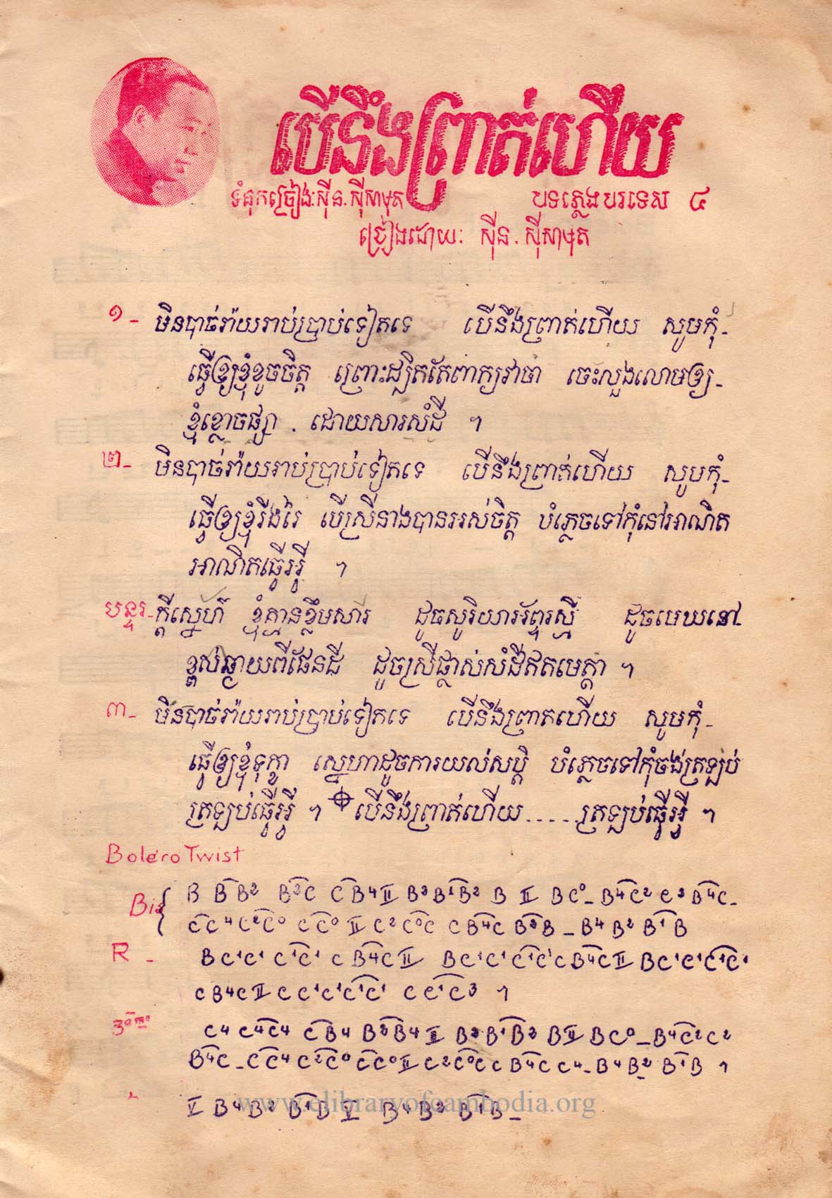 - បើនឹងព្រាត់ហើយ ចំណងជើង ភាសាបារាំង DERNIERS BAISERS ជាបទចម្រៀងដើម មុនថ្ងៃ ១៧ មេសា ១៩៧៥ ច្រៀងដំបូងដោយ ស៊ីន ស៊ីសាមុត