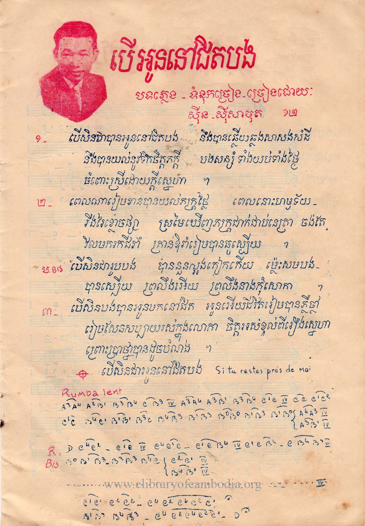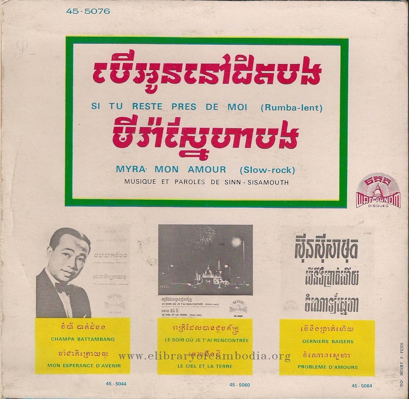 - បើអូននៅជិតបង ចំណងជើងជាភាសាបារាំងគឺ SI TU RESTE PRES DE MOI ជាចម្រៀងដើមមួយបទដែលច្រៀងមុនថ្ងៃ១៧ មេសា ១៩៧៥ ច្រៀងដោយ ស៊ីន ស៊ីសាមុត