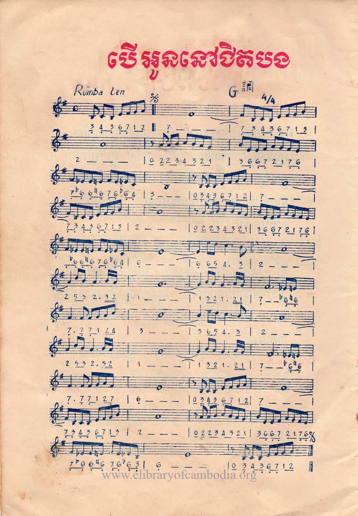 - មាន Music score (យោងតាមសៀវភៅចម្រៀងចំរៀងពិសេសតន្រ្តីវត្តភ្នុំ - បើអូននៅជិតបង )