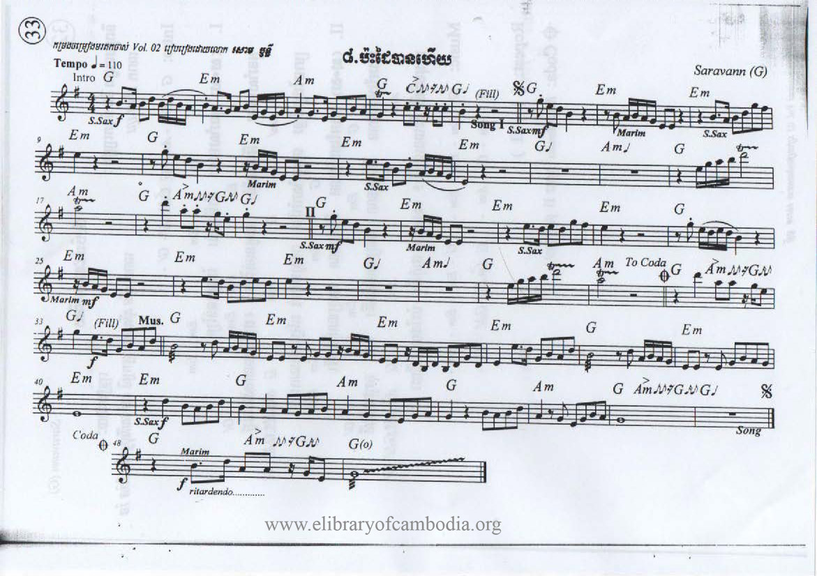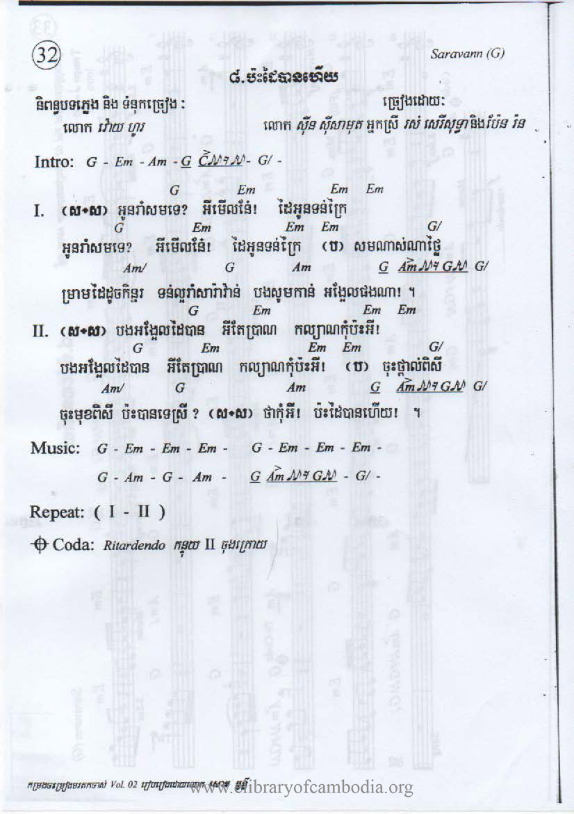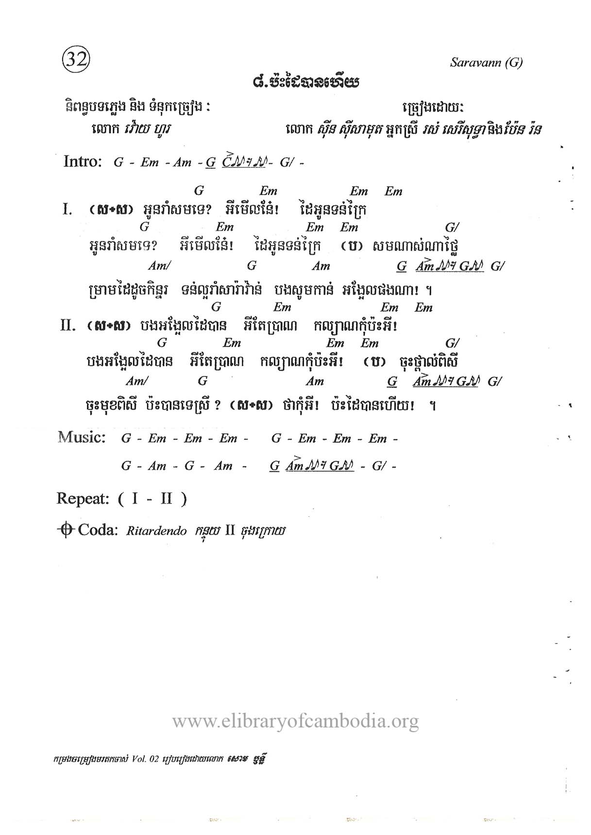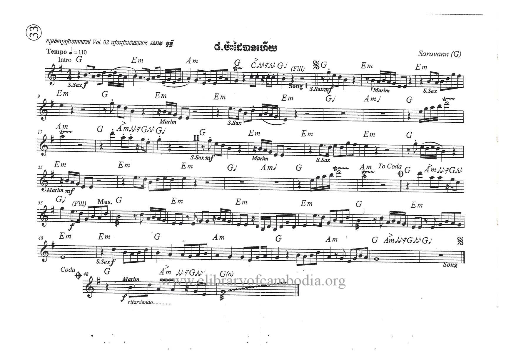 - យើងមានអត្ថបទ និងអក្សរភ្លេង ដកស្រង់ចេញពីសៀវភៅ រៀនលេងបទចម្រៀងដោយខ្លួនឯង- ប៉ះដៃបានហើយ ទំព័រទី ៣៣