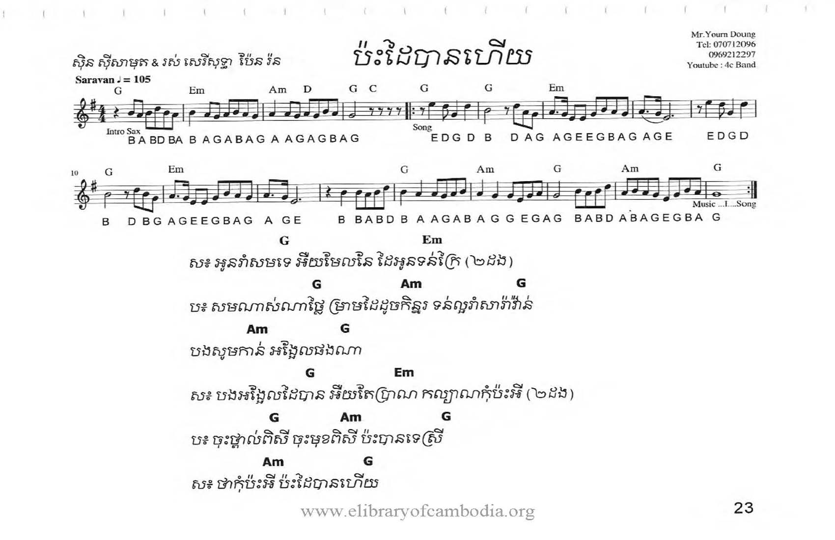 - យើងមានអត្ថបទ និងអក្សរភ្លេង ដកស្រង់ចេញពីសៀវភៅ រៀនលេងព្យ៉ាណូ ណោតងាយស្រួល វគ្គទី២ - ប៉ះដៃបានហើយ - អត្ថបទចម្រៀង - អក្សរភ្លេង ទំព័រទី ២៣