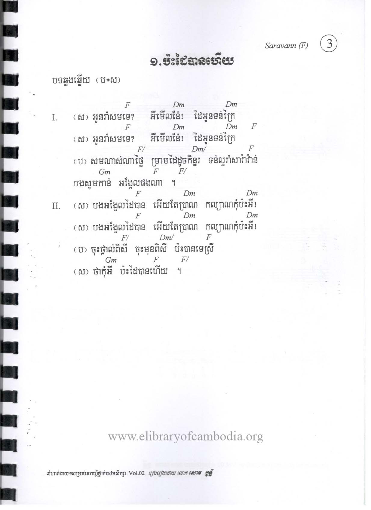 - យើងមានអត្ថបទ និងអក្សរភ្លេង ដកស្រង់ចេញពីសៀវភៅ លំហាត់ចម្រៀងងាយ ៗភាគ២-ប៉ះដៃបានហើយ ទំព័រទី ២ និង ៣