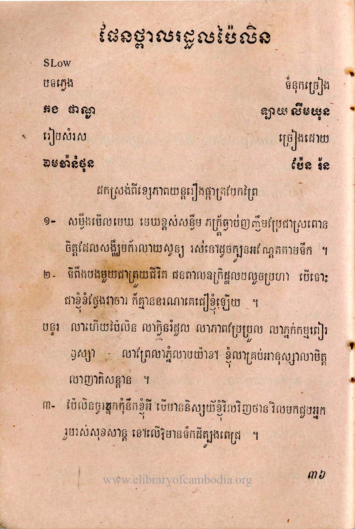 - យើងមានអត្ថបទ និងអក្សរភ្លេង ដកស្រង់ចេញពីសៀវភៅ ប្រជុំចំរៀងភាពយន្ត ១៤០បទ ទំព័រទី ៣៦
