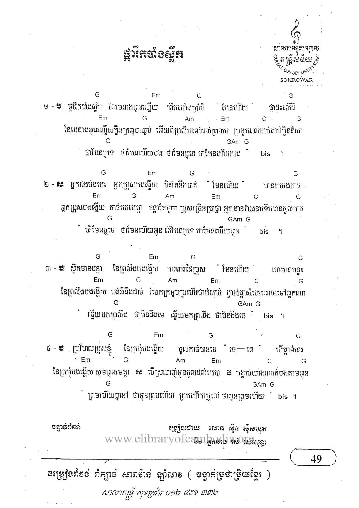 - យើងមានអត្ថបទ និងអក្សរភ្លេង ដកស្រង់ចេញពីសៀវភៅ មរតកស្នាដៃកវីរៀមច្បង ភាគទី ទំព័រទី ៤៨ និង ៤៩