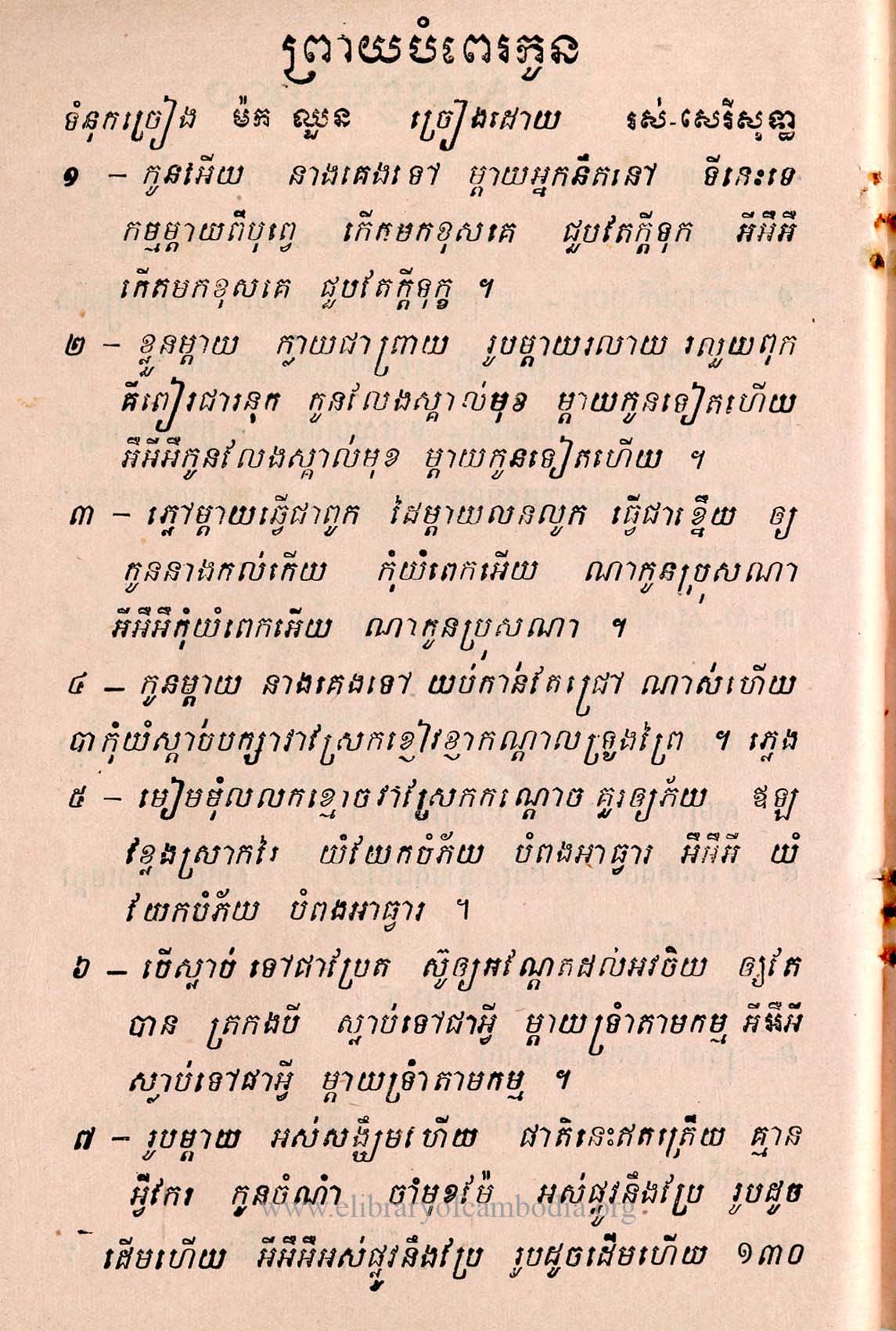 ១- ឱ!កូនអើយនាងគេងទៅ ម្ដាយនាងអើយនិត្យនៅទីនេះទេ ឱ!កម្មម្ដាយពីបុព្វេ កើតមកខុសគេ ជួបតែឱ!ក្ដីទុក្ខ ហាអឺៗ កើតមកខុសគេ ជួបតែឱ!ក្ដីទុក្ខ។