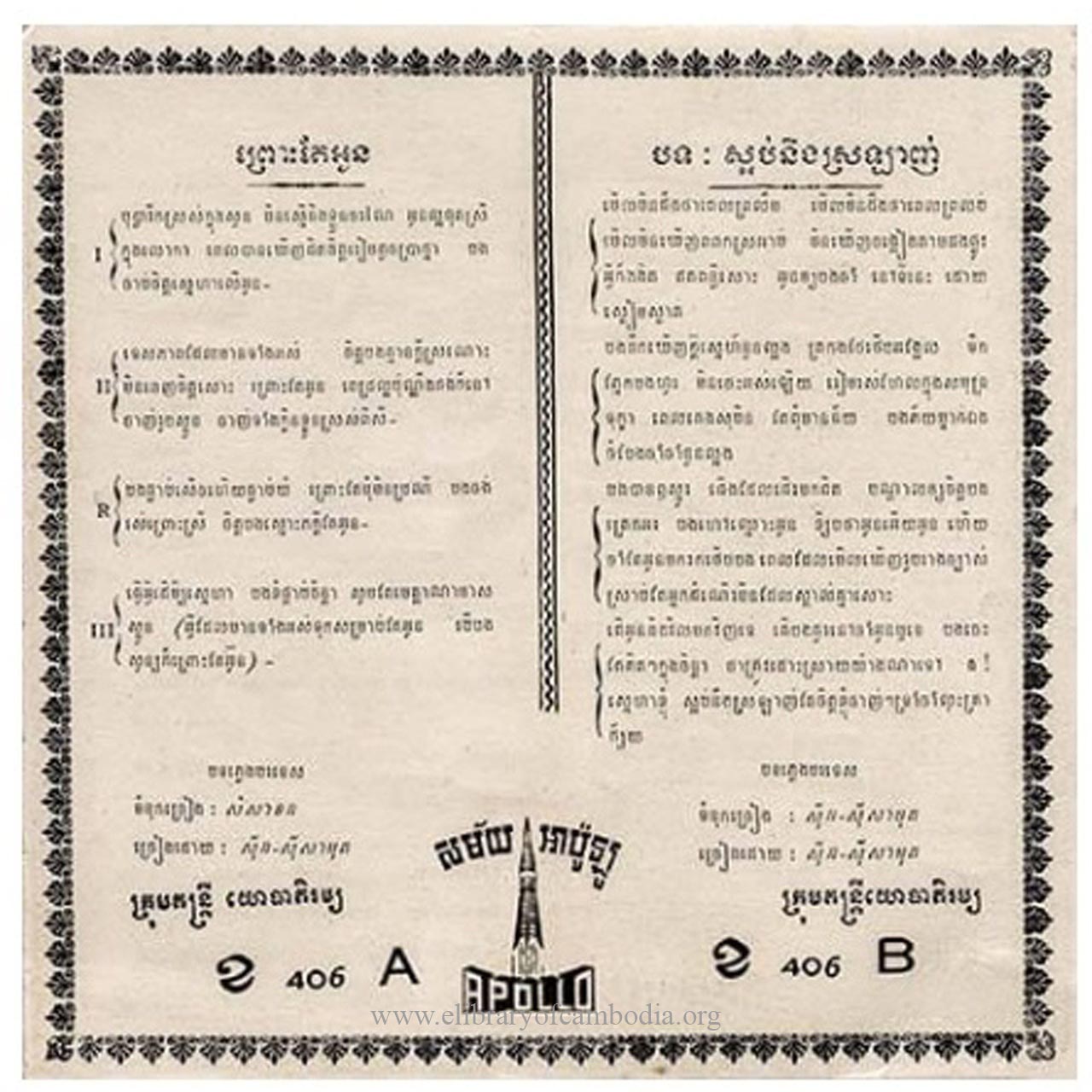 - ចេញផ្សាយជាថាស (Vinyl) ដោយផលិតកម្ម សម័យ អាប៉ូឡូ (ខ-406) - (A) ព្រោះតែអូន - (B) ស្អប់នឹងស្រឡាញ់