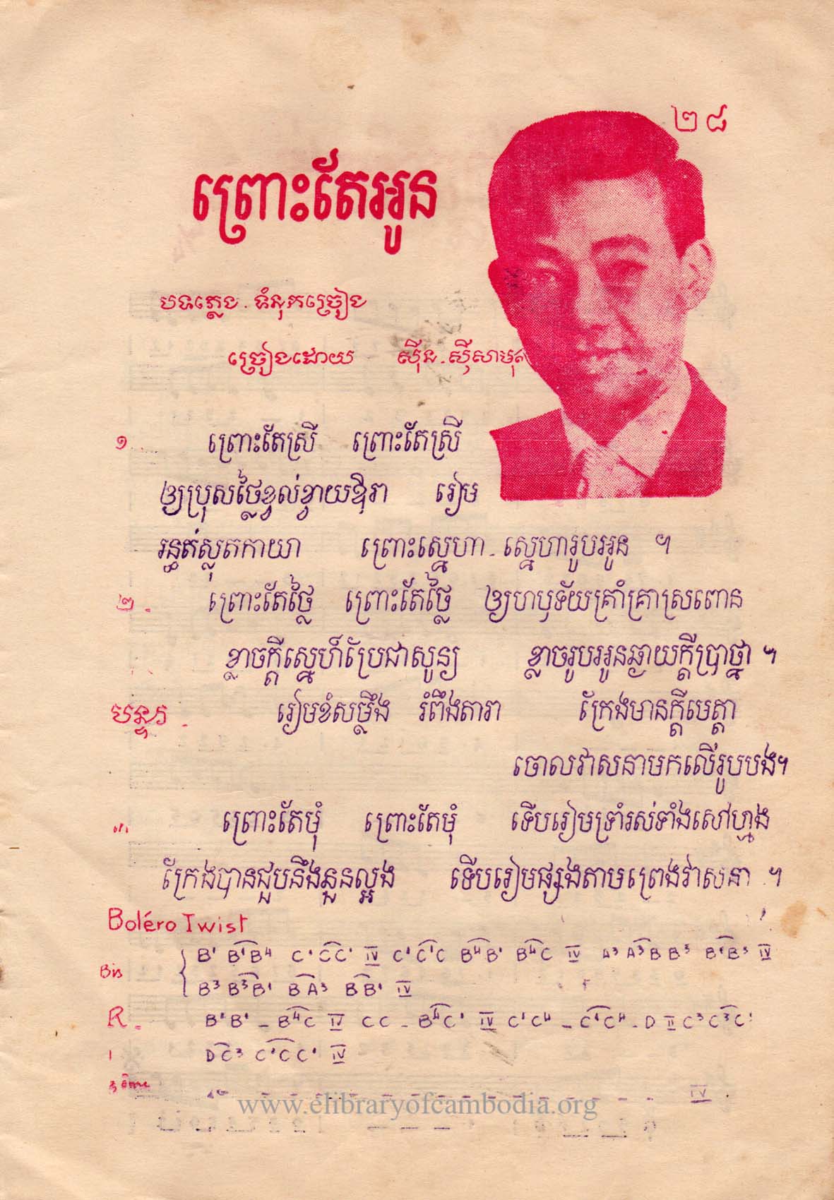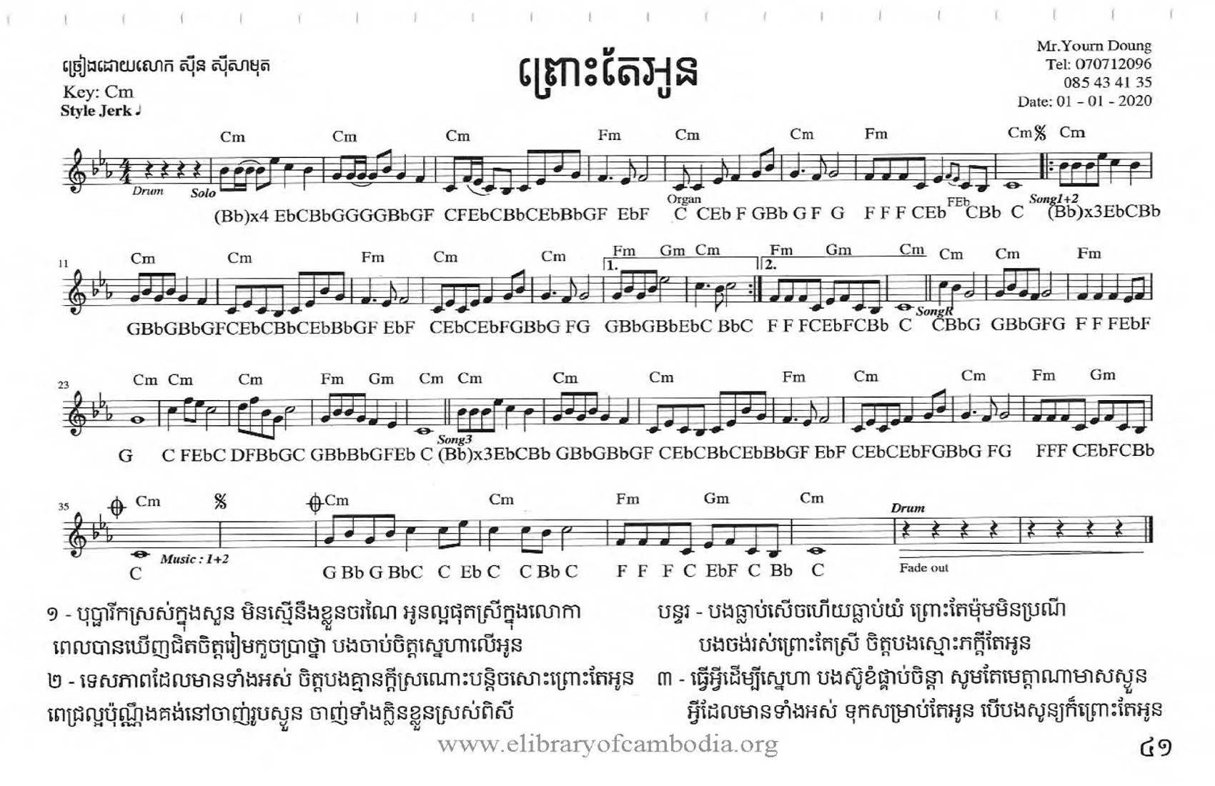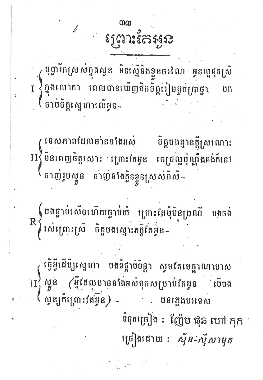 - យើងមានអត្ថបទ និងអក្សរភ្លេង ដកស្រង់ចេញពីសៀវភៅ តន្រ្តីខ្មែរ-ព្រោះតែអូន ទំព័ទី៣៣