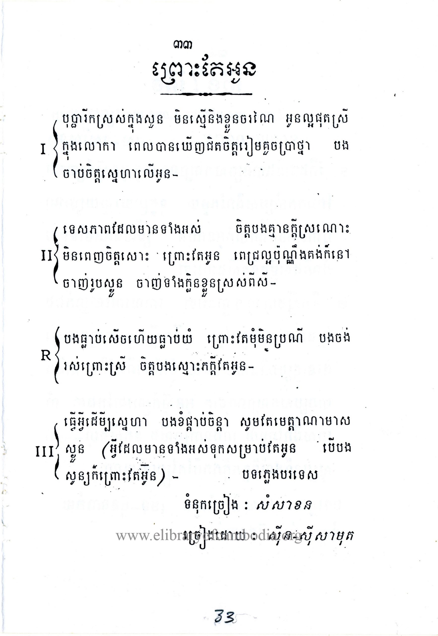 - យើងមានអត្ថបទ និងអក្សរភ្លេង ដកស្រង់ចេញពីសៀវភៅ ចំរៀងពិសេសតន្រ្តីវត្តភ្នុំ - ព្រោះតែអូន ទំព័ទី២៨