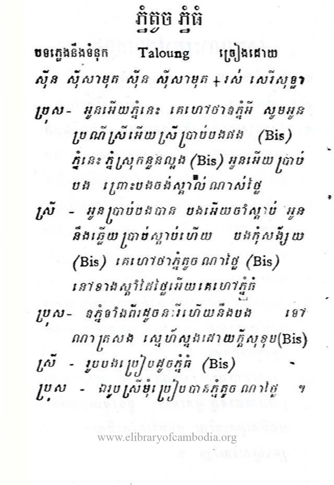 ២ – (ស) អូនប្រាប់បងបាន បងអ្ហើយបងចាំស្ដាប់ អូននឹងឆ្លើយប្រាប់ ស្ដាប់ហើយបងកុំសង្ស័យ (២ដង) គេហៅ ភ្នំតូចណាថ្លៃ (២ដង) នៅខាងស្ដាំដៃ ថ្លៃអ្ហើយ គេហៅ ភ្នំធំ។