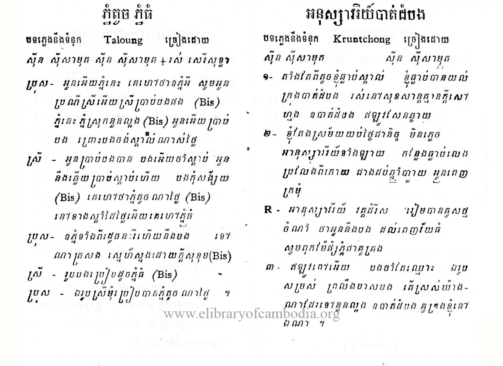 - យើងមានអត្ថបទ និងអក្សរភ្លេង ដកស្រង់ចេញពីសៀវភៅ ចំរៀងជ្រើសរើសឆ្លងឆ្លើយ ស៊ីន ស៊ីសាមុត រស់ សេរីសិទ្ធា ទំព័រទី ១