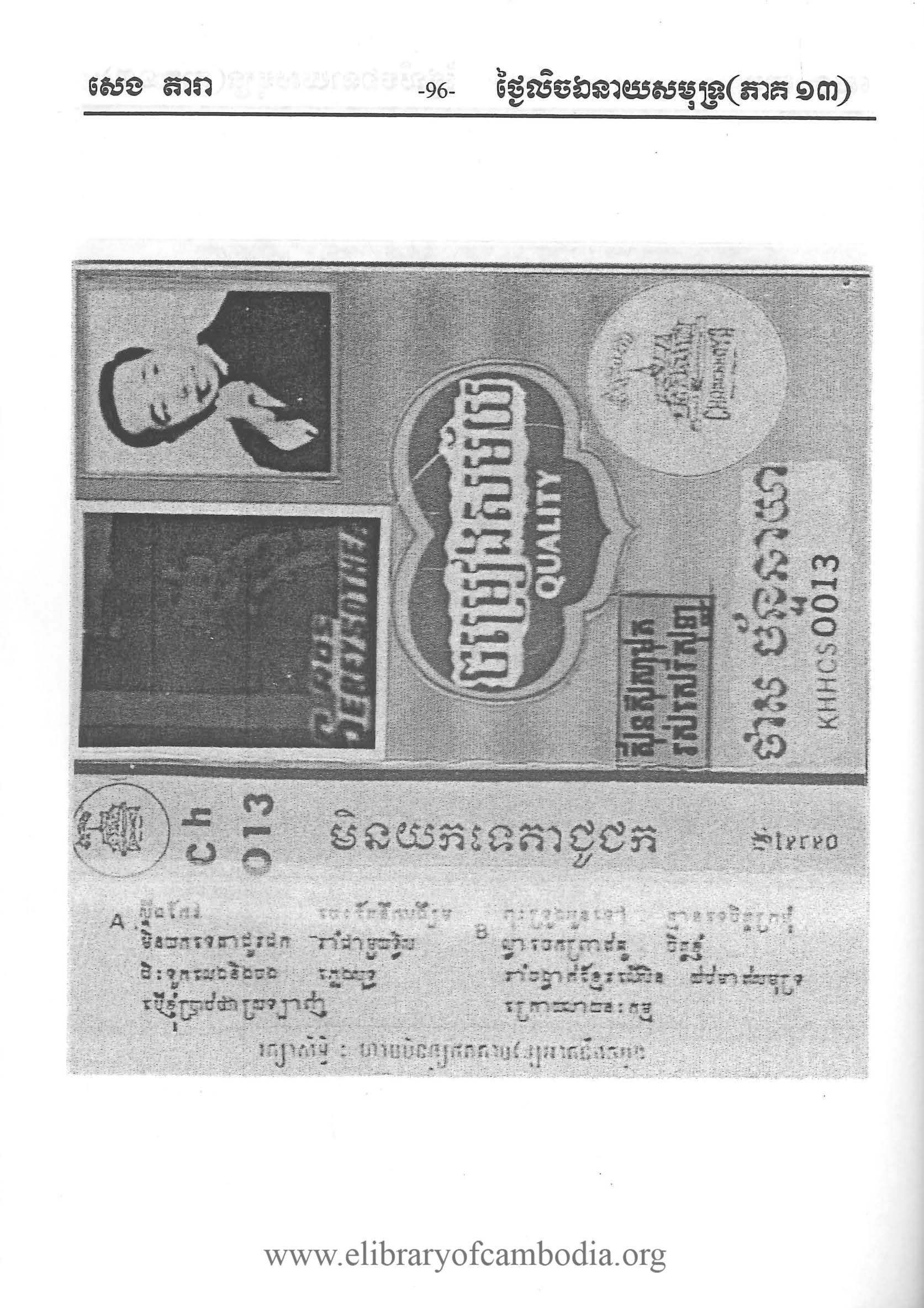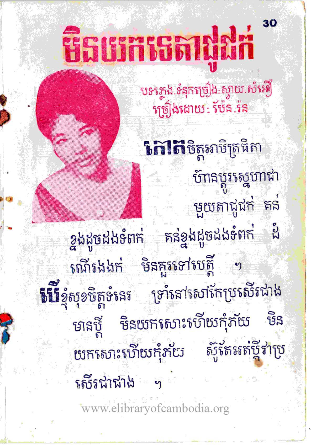 យើងខ្ញុំមានបំណងរក្សាសម្បត្តិខ្មែរទុកនៅលើគេហទំព័រ www.elibraryofcambodia.org នេះ ព្រមទាំងផ្សព្វផ្សាយសម្រាប់បម្រើជាប្រយោជន៍សាធារណៈ ដោយឥតគិតរក និងយកកម្រៃ នៅមុនថ្ងៃទី១៧ ខែមេសា ឆ្នាំ១៩៧៥ ចម្រៀងខ្មែរបានថតផ្សាយលក់លើថាសចម្រៀង 45 RPM 33 ½ RPM 78 RPM​ ដោយផលិតកម្ម ថាស កណ្ដឹងមាស ឃ្លាំងមឿង ចតុមុខ ហេងហេង សញ្ញាច័ន្ទឆាយា នាគមាស បាយ័ន ផ្សារថ្មី ពស់មាស ពែងមាស ភួងម្លិះ ភ្នំពេជ្រ គ្លិស្សេ ភ្នំពេញ ភ្នំមាស មណ្ឌលតន្រ្តី មនោរម្យ មេអំបៅ រូបតោ កាពីតូល សញ្ញា វត្តភ្នំ វិមានឯករាជ្យ សម័យអាប៉ូឡូ ​​​ សាឃូរ៉ា ខ្លាធំ សិម្ពលី សេកមាស ហង្សមាស ហនុមាន ហ្គាណេហ្វូ​ អង្គរ Lac Sea សញ្ញា អប្សារា អូឡាំពិក កីឡា ថាសមាស ម្កុដពេជ្រ មនោរម្យ បូកគោ ឥន្ទ្រី Eagle ទេពអប្សរ ចតុមុខ ឃ្លោកទិព្វ ខេមរា មេខ្លា សាកលតន្ត្រី មេអំបៅ Diamond Columbo ហ្វីលិព Philips EUROPASIE EP ដំណើរខ្មែរ​ ទេពធីតា មហាធូរ៉ា ជាដើម​។