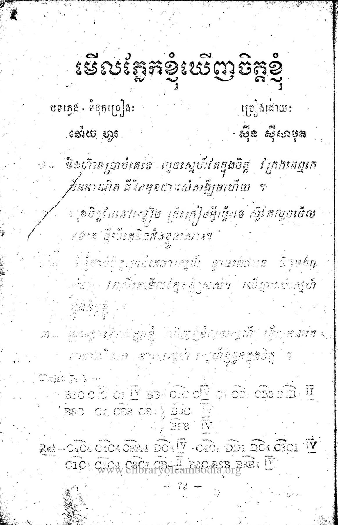 - មើលភ្នែកខ្ញុំឃើញចិត្តខ្ញុំ ជាបទចម្រៀងដើម មុនថ្ងៃ១៧ មេសា ១៩៧៥ ច្រៀងដំបូង ដោយ ស៊ីន ស៊ីសាមុត