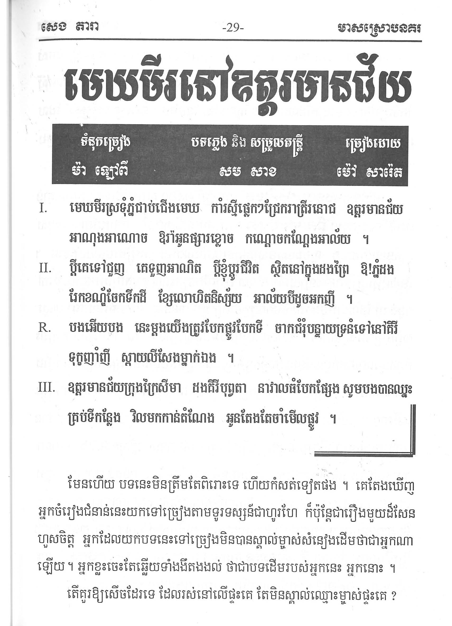 - មេឃមីរនៅឧត្តរមានជ័យ ជាចំណងជើងនៃបទចម្រៀងដើម មុនថ្ងៃ១៧ មេសា ១៩៧៥ ច្រៀងដំបូងដោយ ម៉ៅ សារ៉េត