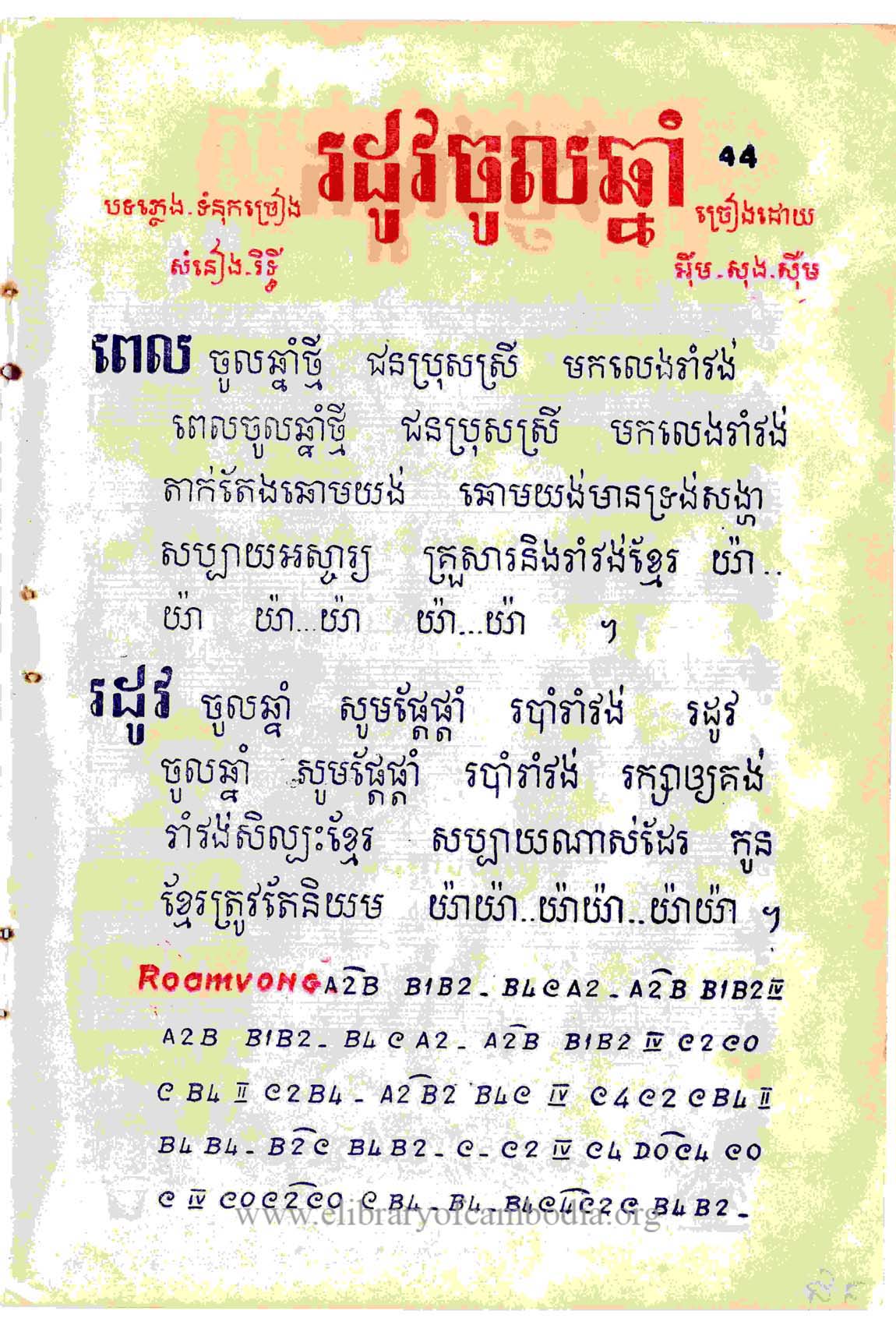 • យើងមានអត្ថបទ និងអក្សរភ្លេង​ ដកស្រង់ចេញពីសៀវភៅ រាំវង់ឆ្នាំថ្មី អង្គរ-កម្ពុជាថាស-ច័ន្ទឆាយា វត្តភ្នំ-វិទ្យុជាតិ-រដូវចូលឆ្នាំ-អក្សរភ្លេង