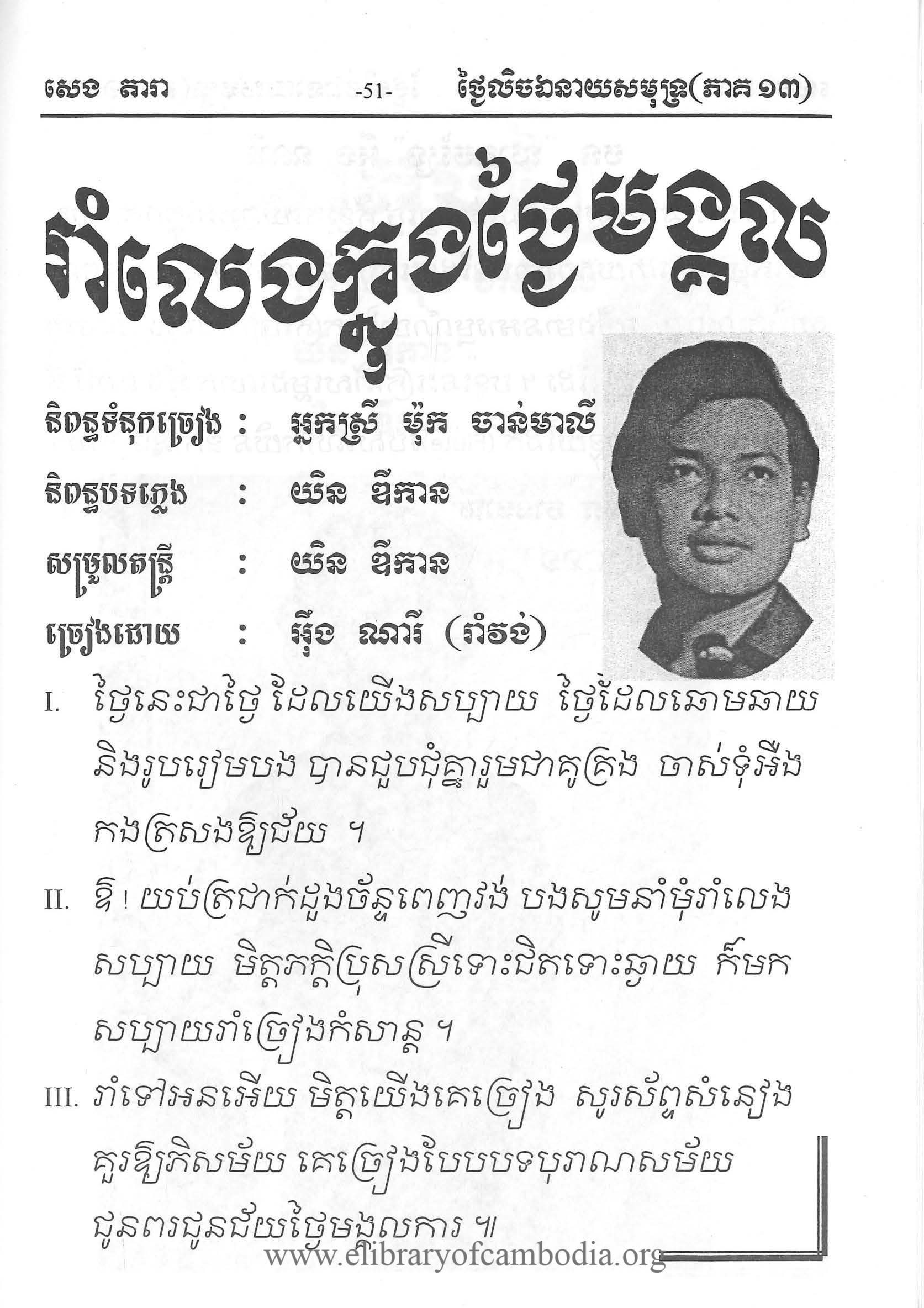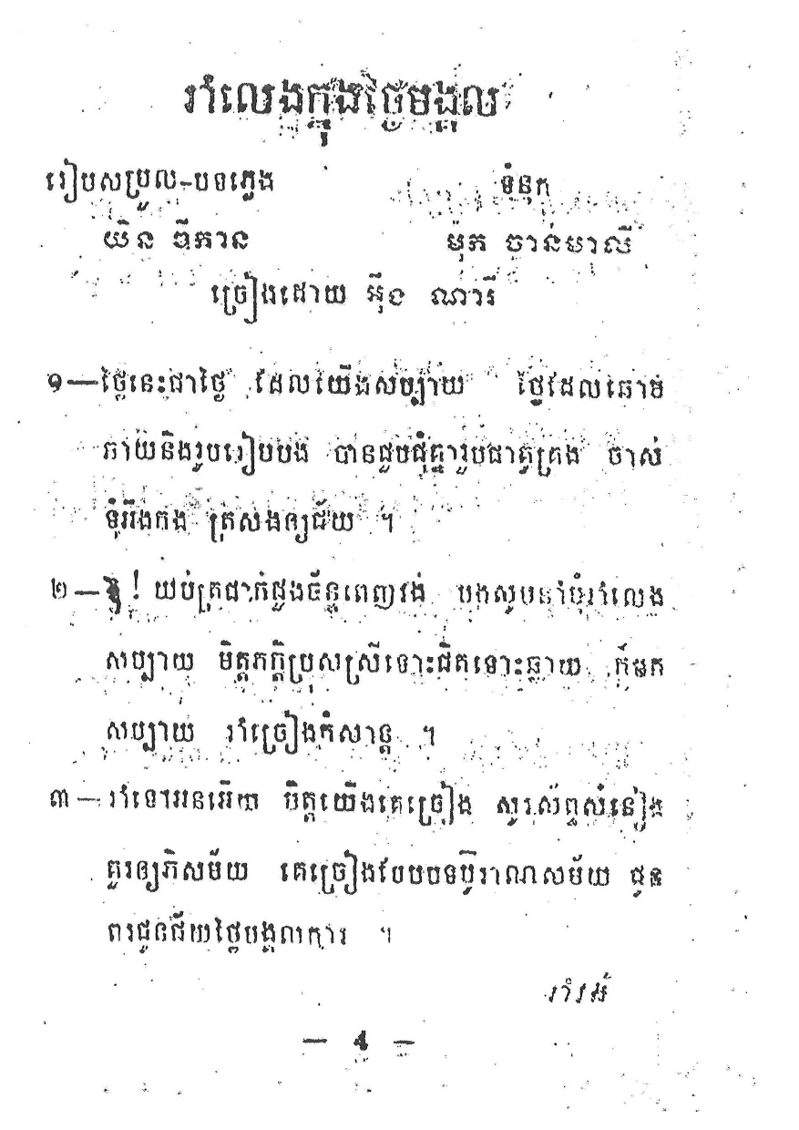 - រាំលេងក្នុងថ្ងៃមង្គល ជាចំណងជើងនៃបទចម្រៀងដើម មុនថ្ងៃ១៧ មេសា ១៩៧៥ ច្រៀងដំបូងដោយ អ៊ឹង ណារី