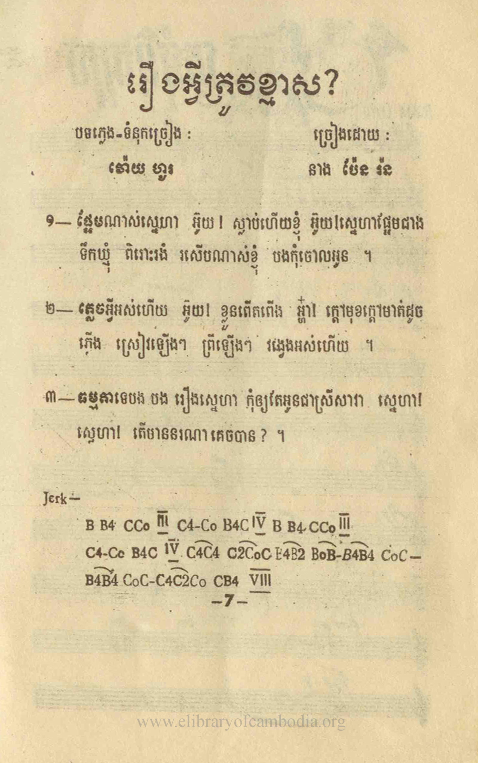 • ចម្រៀងដែលខ្ញុំស្រឡាញ់ - រឿងអ្វីត្រូវខ្មាស - ទំព័រ ៧ មានអត្ថបទចម្រៀងនិង អក្សរភ្លេង