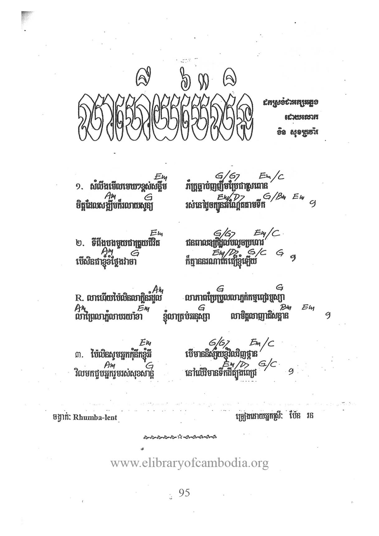 - យើងមានអត្ថបទ និងអក្សរភ្លេង ដកស្រង់ចេញពីសៀវភៅកម្រងចំរៀងជ្រើសរើសប្រជុំបទល្បីៗនាអតីតកាល ទំព័ទី៤១