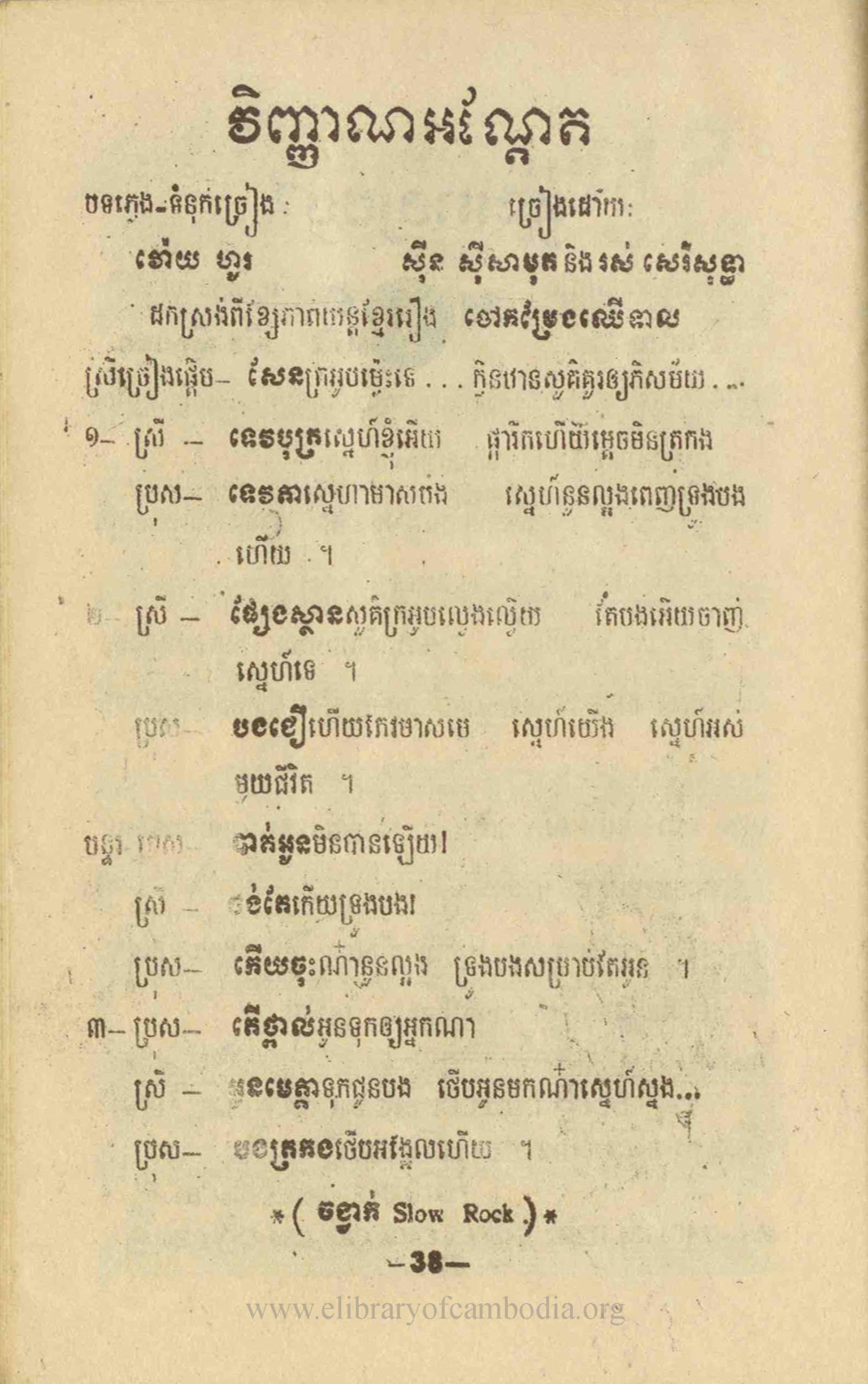 យើងខ្ញុំមានបំណងរក្សាសម្បត្តិខ្មែរទុកនៅលើគេហទំព័រ www.elibraryofcambodia.org នេះ ព្រមទាំងផ្សព្វផ្សាយសម្រាប់បម្រើជាប្រយោជន៍សាធារណៈ ដោយឥតគិតរក និងយកកម្រៃ នៅមុនថ្ងៃទី១៧ ខែមេសា ឆ្នាំ១៩៧៥ ចម្រៀងខ្មែរបានថតផ្សាយលក់លើថាសចម្រៀង 45 RPM 33 ½ RPM 78 RPM ដោយផលិតកម្ម ថាស កណ្ដឹងមាស ឃ្លាំងមឿង ចតុមុខ ហេងហេង សញ្ញាច័ន្ទឆាយា នាគមាស បាយ័ន ផ្សារថ្មី ពស់មាស ពែងមាស ភួងម្លិះ ភ្នំពេជ្រ គ្លិស្សេ ភ្នំពេញ ភ្នំមាស មណ្ឌលតន្រ្តី មនោរម្យ មេអំបៅ រូបតោ កាពីតូល សញ្ញា វត្តភ្នំ វិមានឯករាជ្យ សម័យអាប៉ូឡូ សាឃូរ៉ា ខ្លាធំ សិម្ពលី សេកមាស ហង្សមាស ហនុមាន ហ្គាណេហ្វូ អង្គរ Lac Sea សញ្ញា អប្សារា អូឡាំពិក កីឡា ថាសមាស ម្កុដពេជ្រ មនោរម្យ បូកគោ ឥន្ទ្រី Eagle ទេពអប្សរ ចតុមុខ ឃ្លោកទិព្វ ខេមរា មេខ្លា សាកលតន្ត្រី មេអំបៅ Diamond Columbo ហ្វីលិព Philips EUROPASIE EP ដំណើរខ្មែរ ទេពធីតា មហាធូរ៉ា ជាដើម។