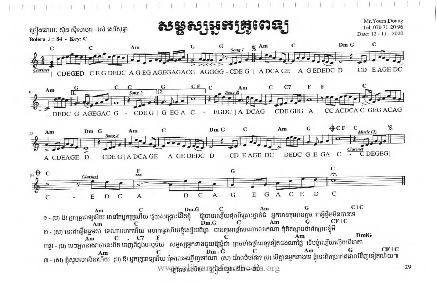 - យើងមានអត្ថបទ និងអក្សរភ្លេង ដកស្រង់ចេញពីសៀវភៅ រៀនលេងតន្ត្រី ណោតងាយស្រួល ភាគទី១១ ទំព័រទី២៩